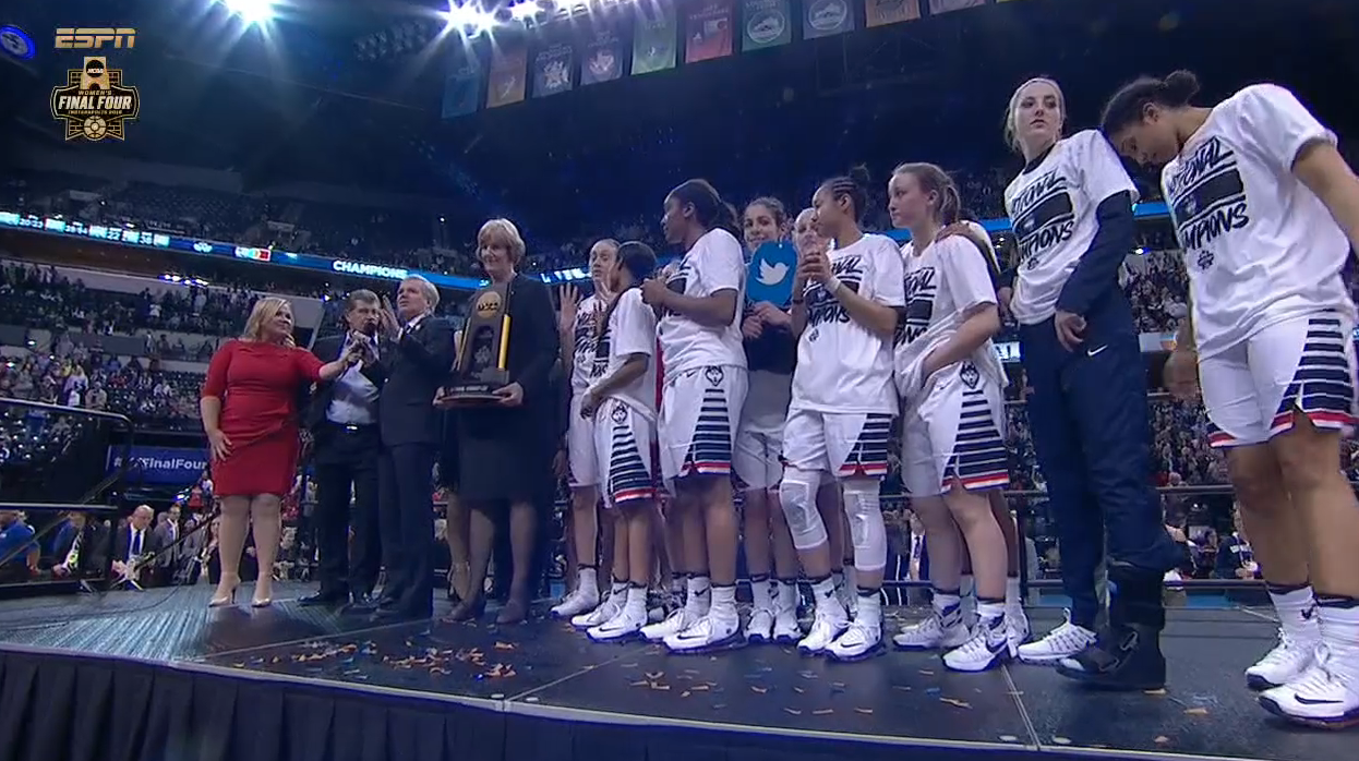 In fact, photos of the team using the Twitter Mirror during games leading to the final made it into several newspapers. Members of the UConn basketball team, according to one report, do not tweet during the regular season. But as soon as the team won the American Athletic Conference Tournament March 7, the women athletes were out on the court using the Twitter Mirror to pose for pictures and videos. The Twitter Mirror allows users to take a selfie that is then sent out over the event’s Twitter feed.