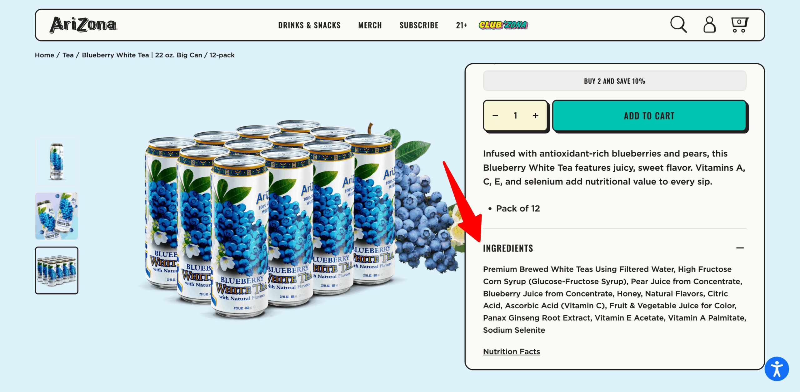 Cans of AriZona blueberry white tea claim that the product contains “100% natural white tea.”
