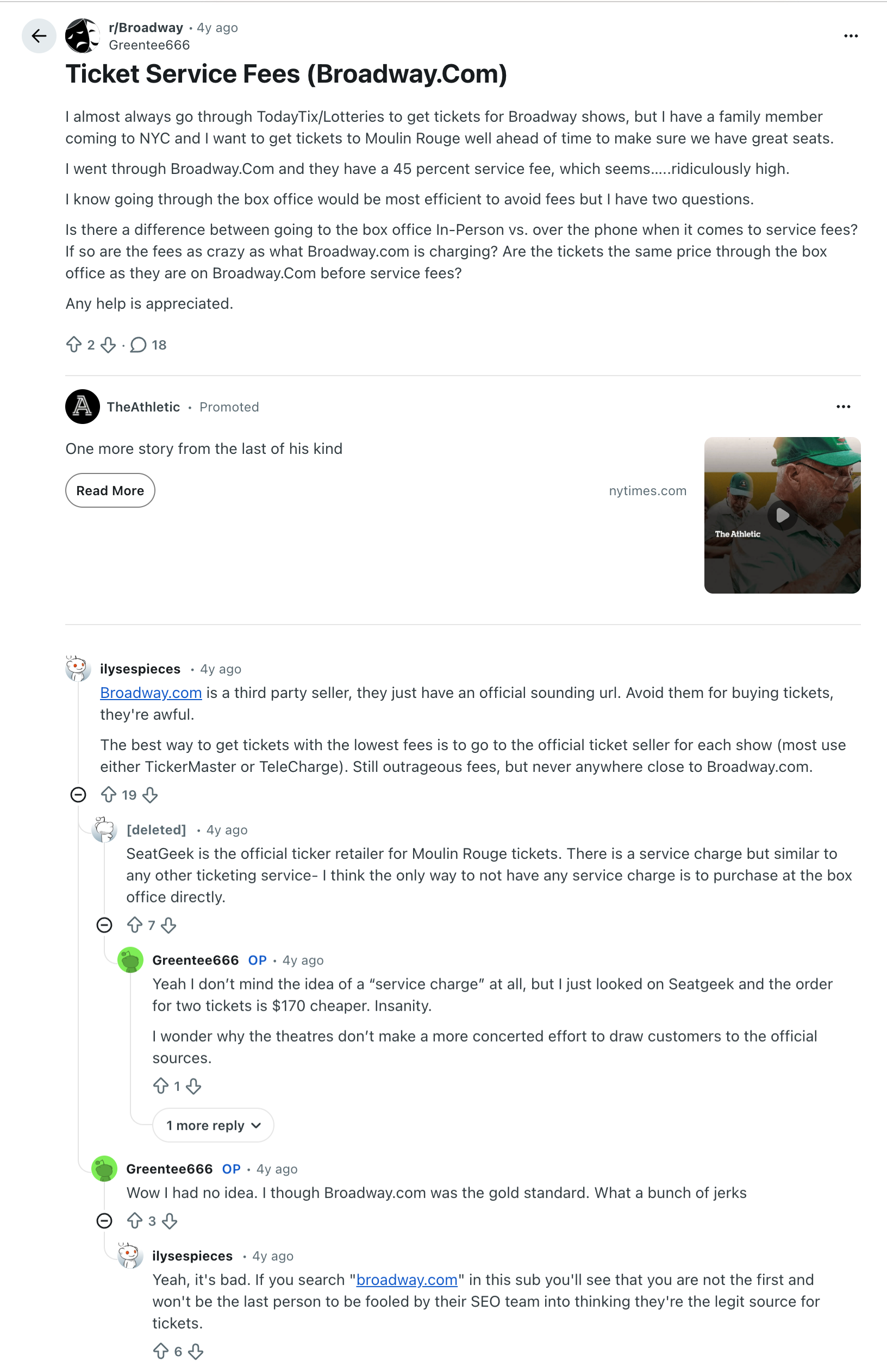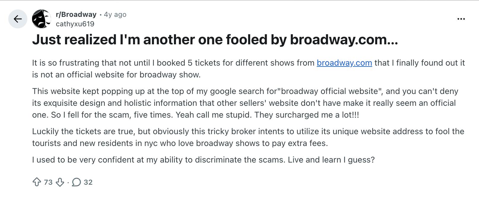 “I though[t] Broadway.com was the gold standard,” wrote one consumer on Reddit who sought advice after encountering a 45% service fee on the site. Another user reported that Broadway.com “kept popping up at the top of my google search for ‘broadway official website.’”