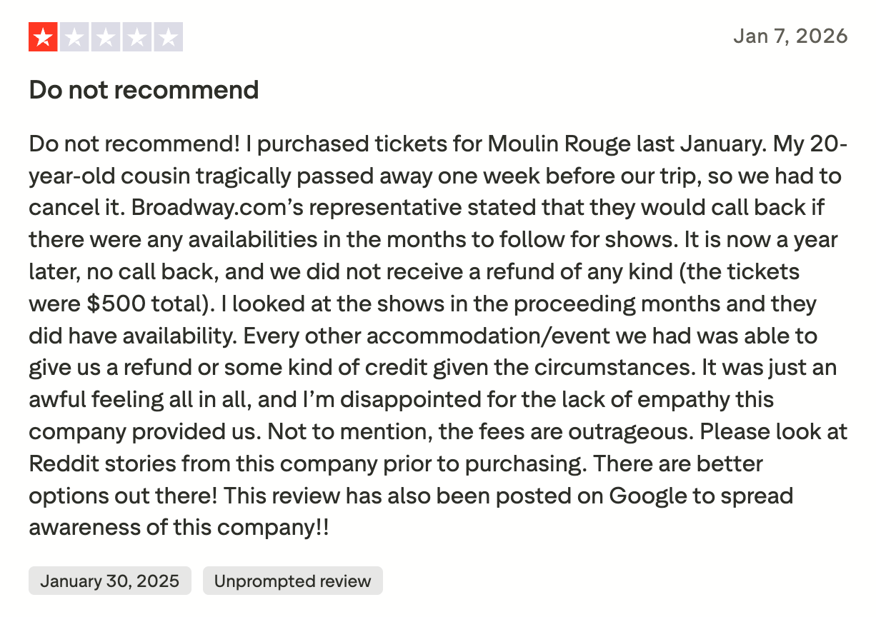 Broadway.com did not respond to a request for comment. Trustpilot also did not respond to an inquiry regarding its warning to consumers.