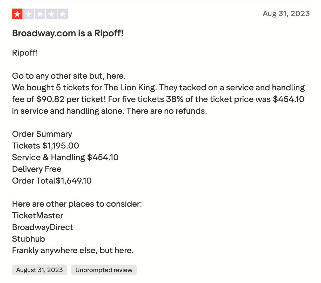 Over the years, consumers have complained about being misled into believing that Broadway.com is directly affiliated with Broadway only to then face exorbitant fees like those noted above.