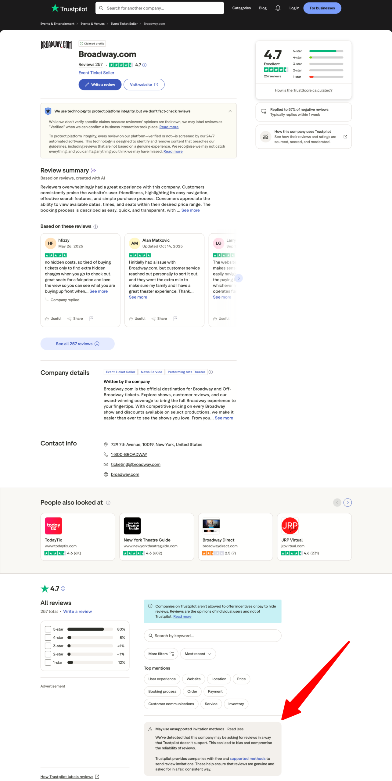 (Of note, although Broadway.com has a 4.7-star rating on Trustpilot, the review platform warns that the company may be getting reviews through “unsupported invitation methods,” which can “lead to bias and compromise the reliability of reviews.”)