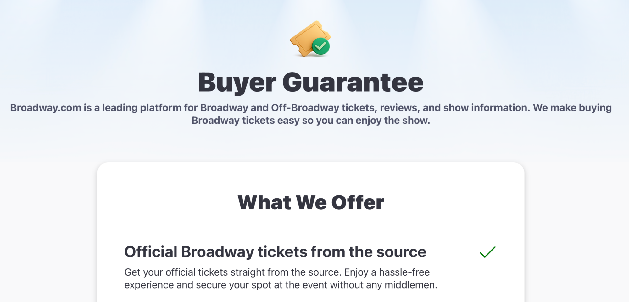 The site’s official-sounding name, combined with language on its homepage and in Google ads promoting “Official Broadway Tickets,” gives the impression that it operates as the primary box office. Its “Buyer Guarantee” further reassures shoppers that tickets come “straight from the source,” as opposed to from a reseller on the secondary market.
