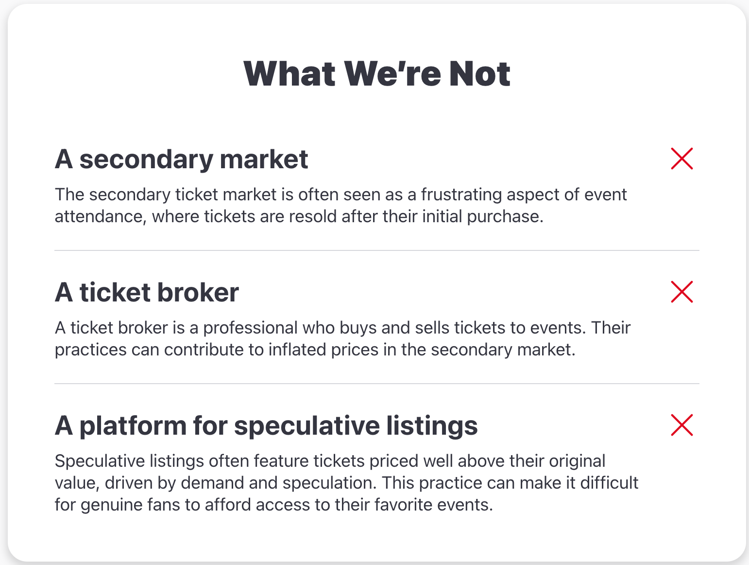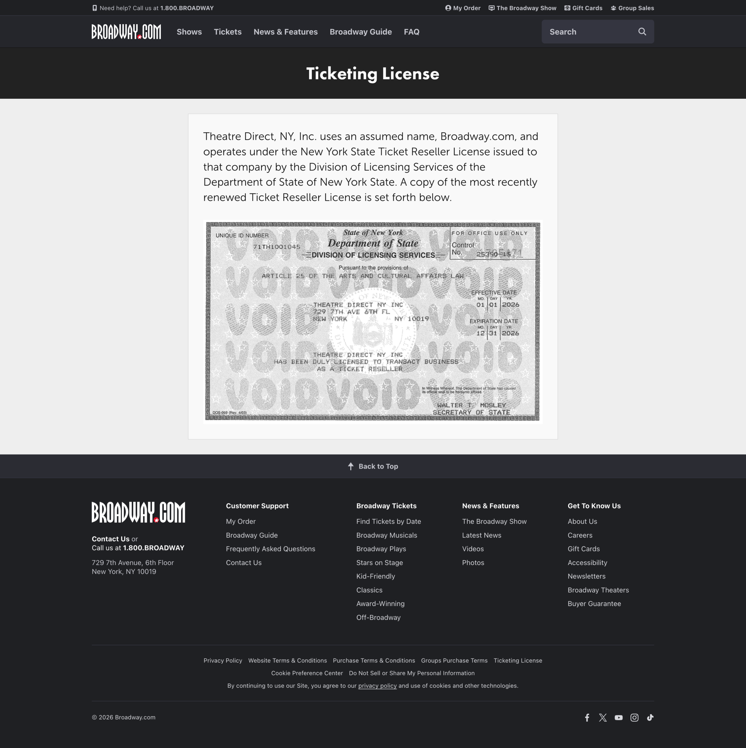 This distinction is disclosed, but only in less visible places, such as in a ticket reseller license linked at the very bottom of Broadway.com. A separate “Reseller Notice,” similarly buried on the site in its terms and conditions, further states that Broadway.com “is for the secondary sale of tickets” and is not affiliated with “any venue, box office or event.”