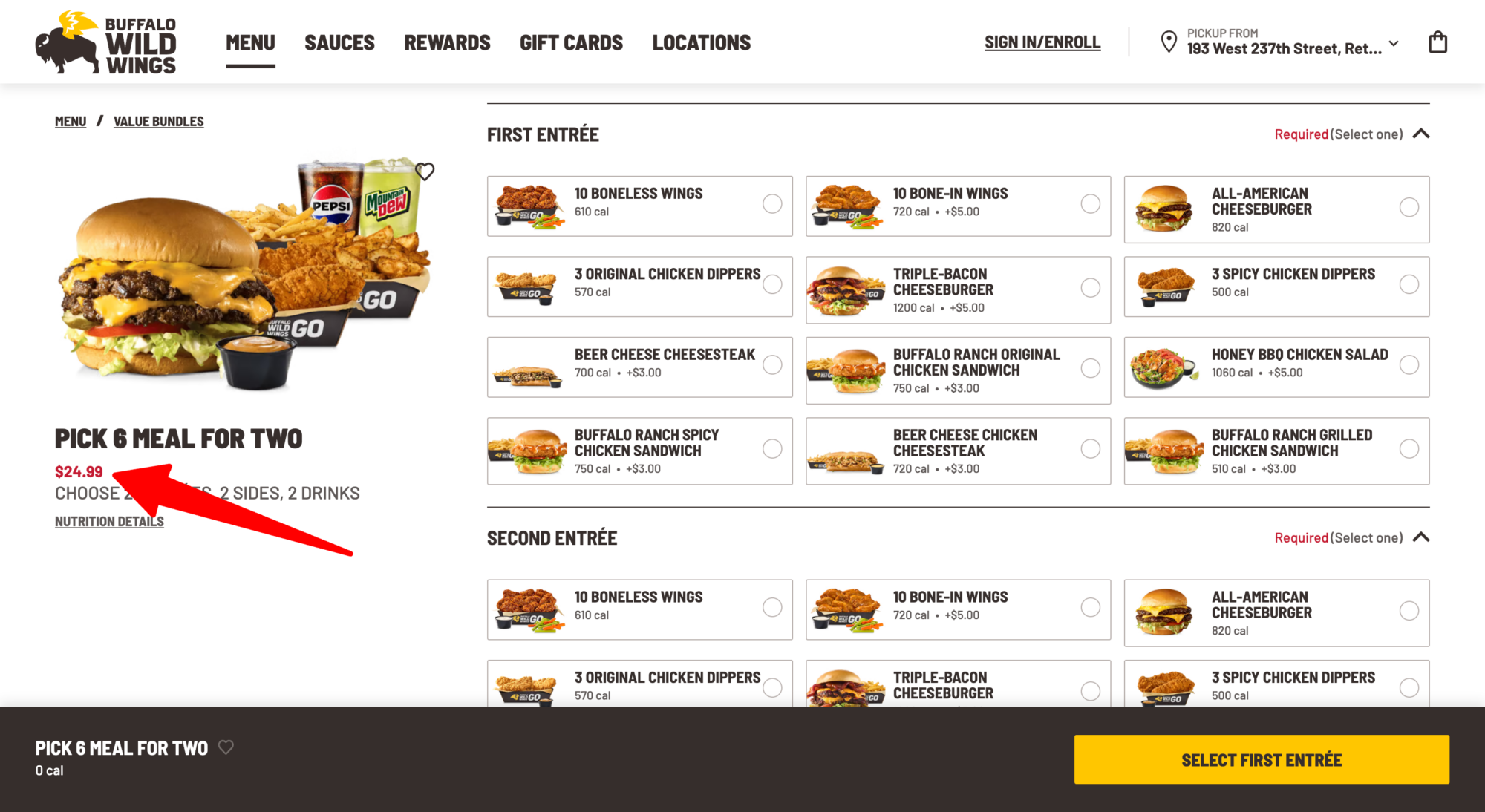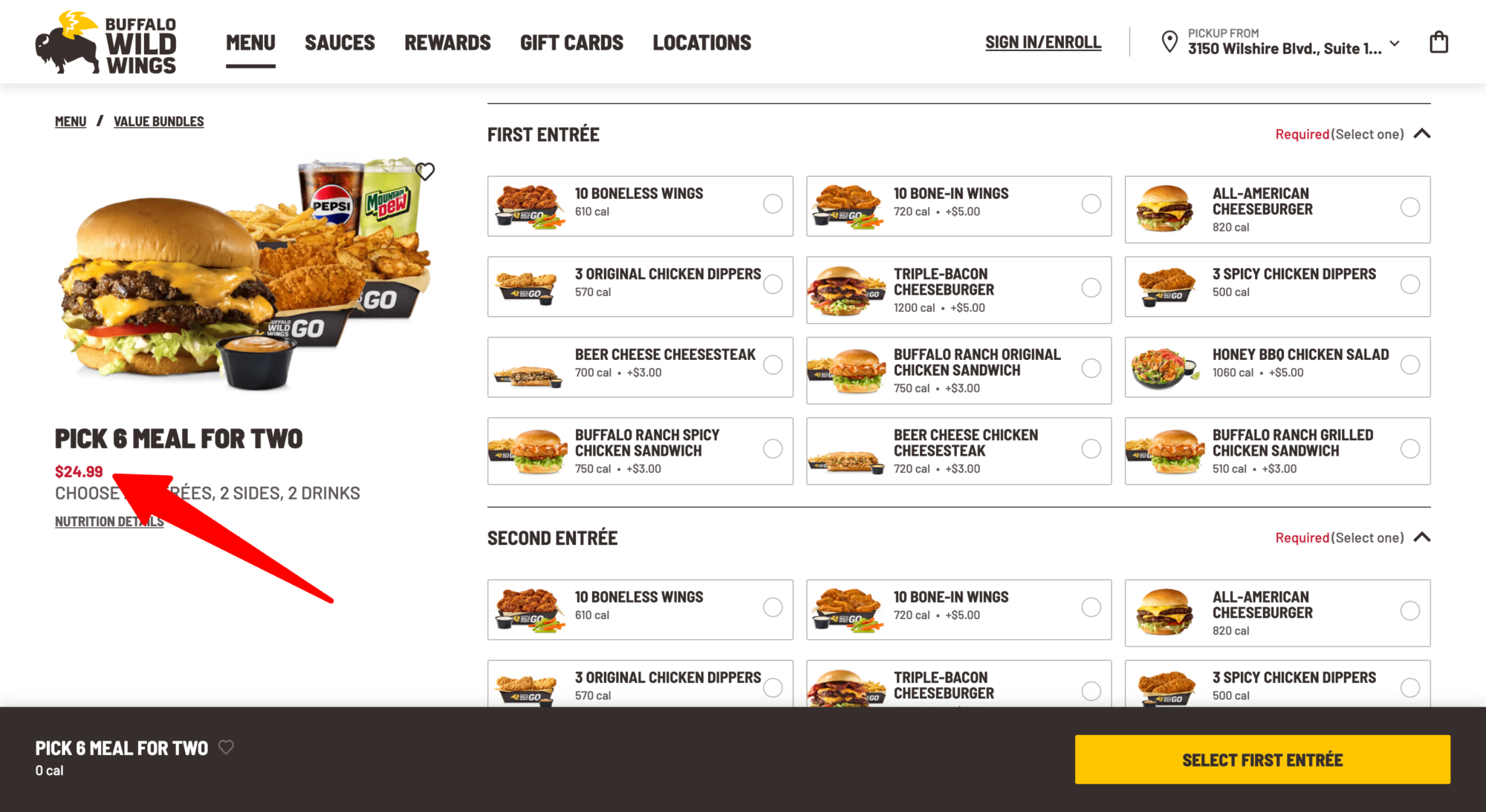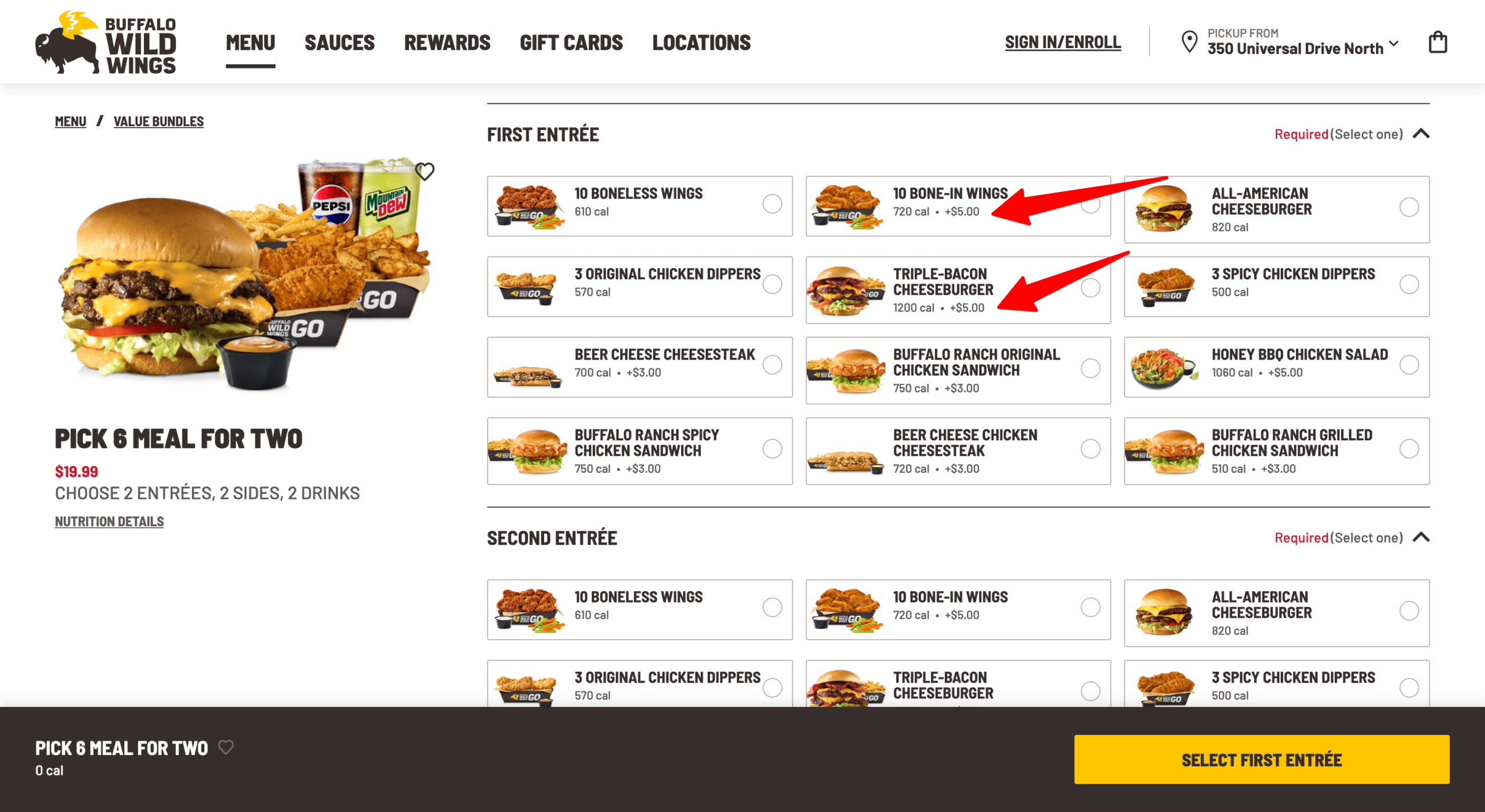 That’s because the majority of the Pick 6 Meal entrees – 8 out of 12 – are only available at an additional cost, TINA.org found when ordering online from a BWW location in Connecticut. This includes two entrees featured in ads promoting the deal – the 10 bone-in wings (see commercial above) and the triple-bacon cheeseburger – each of which cost an extra $5.