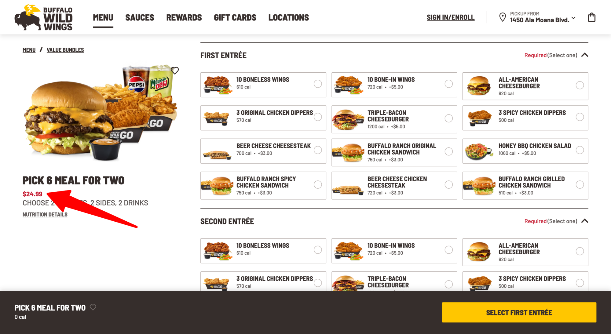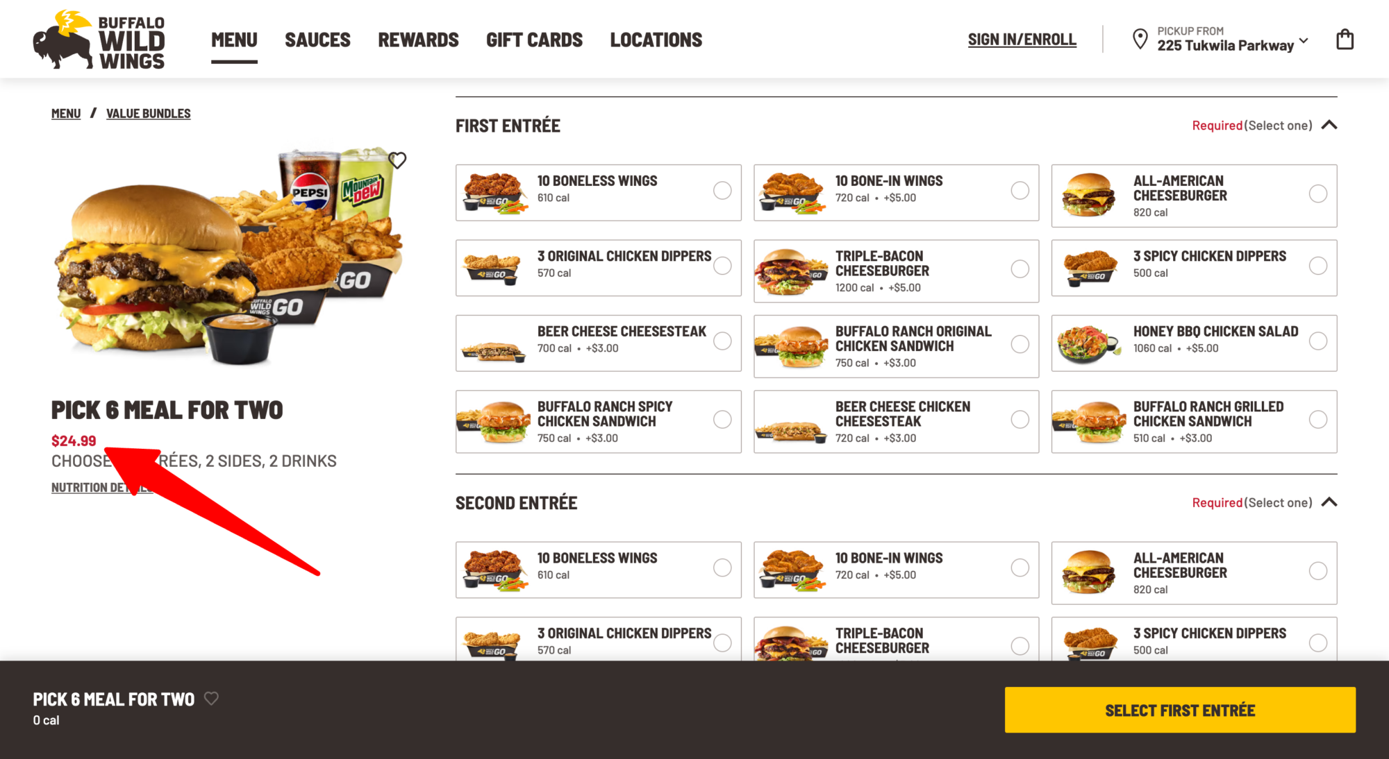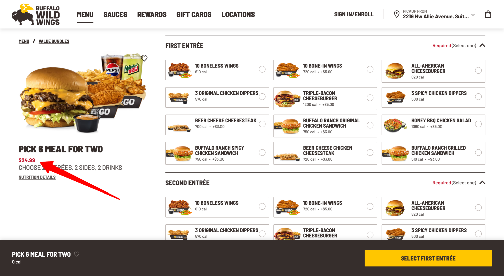 That’s because the majority of the Pick 6 Meal entrees – 8 out of 12 – are only available at an additional cost, TINA.org found when ordering online from a BWW location in Connecticut. This includes two entrees featured in ads promoting the deal – the 10 bone-in wings (see commercial above) and the triple-bacon cheeseburger – each of which cost an extra $5.