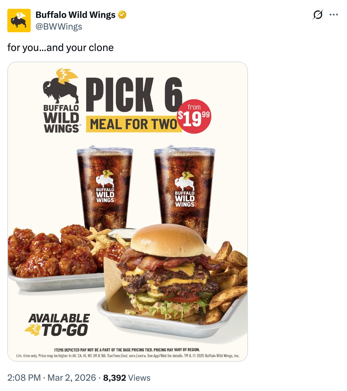 During March Madness, BWW has been running TV and social media ads for its Pick 6 Meal for Two promotion in which the restaurant says you can get two entrees, two sides and two drinks for just $19.99.