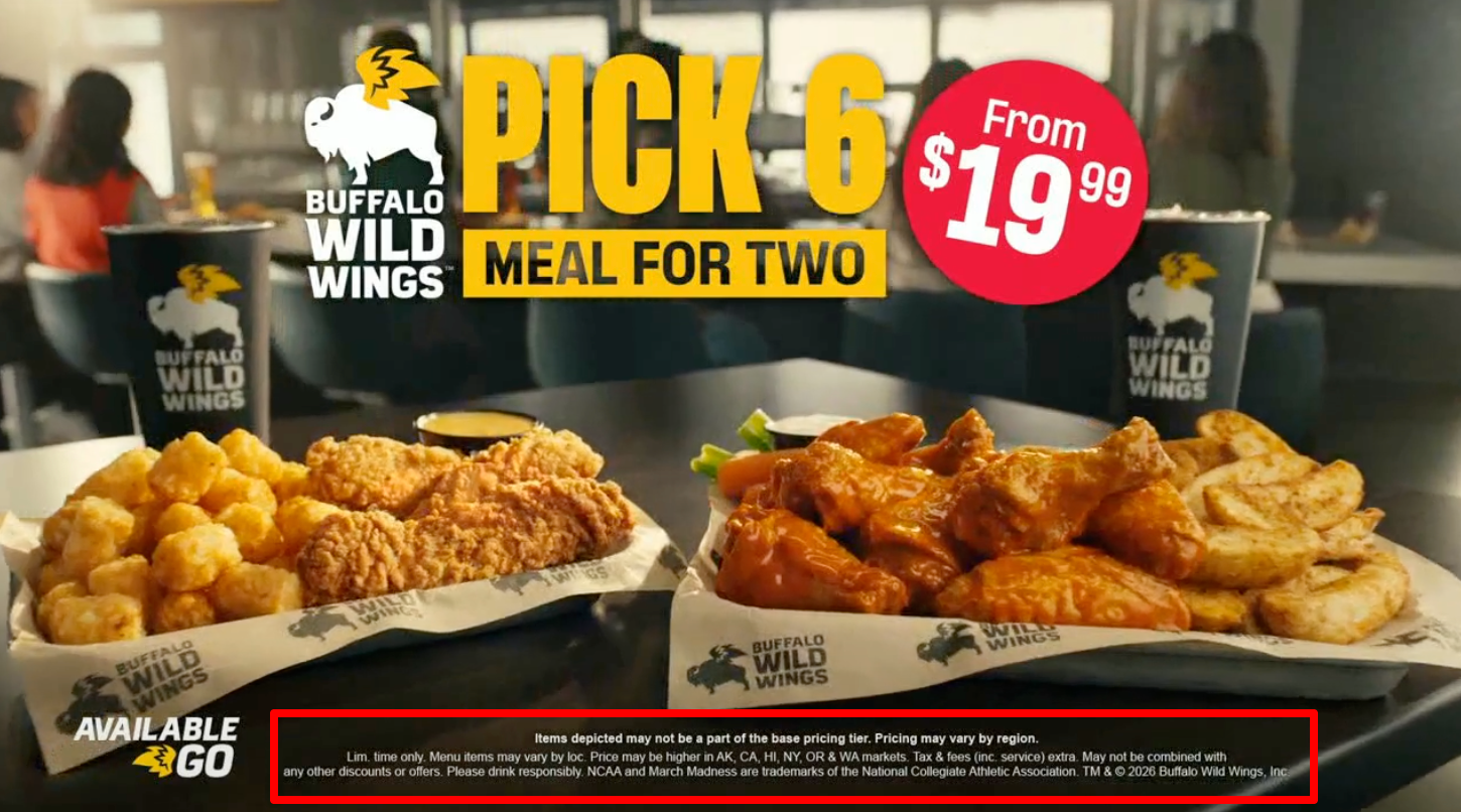 But why feature the items at all if they aren’t actually part of the offer, much less advertise a price ($19.99) that doesn’t apply to the majority of the entrees that are part of the advertised deal? And while on-screen text includes the qualifier “from” $19.99, other references to the price by BWW’s talking buffalo Hank state that the deal is “for” $19.99.