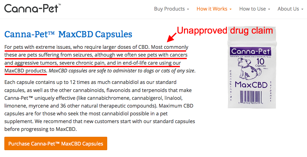 Only problem is some of the company’s health claims were recently found by the FDA to be barking up the wrong tree, in that they established Canna-Pet products as drugs intended to mitigate, treat, or prevent disease in animals. That’s a no-no without FDA approval, which Canna-Pet does not have. Two of the four claims cited in the FDA warning letter still appear on Canna-Pet’s website. One is highlighted above.