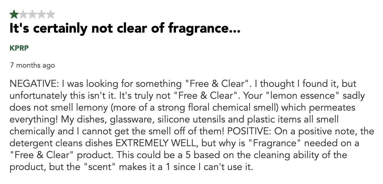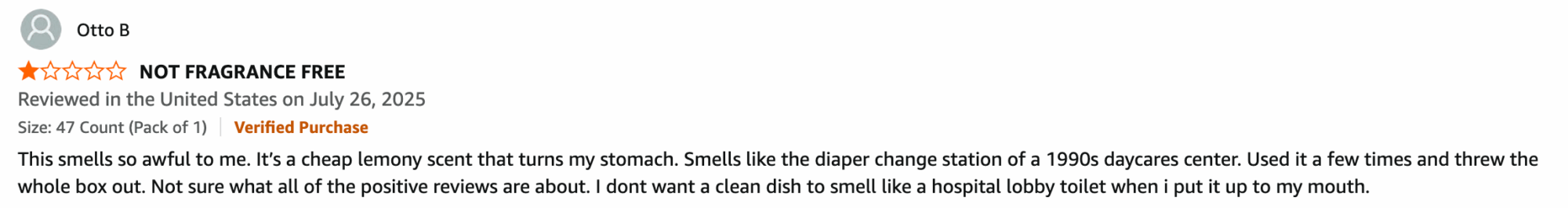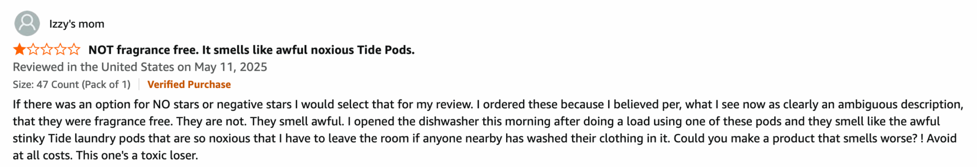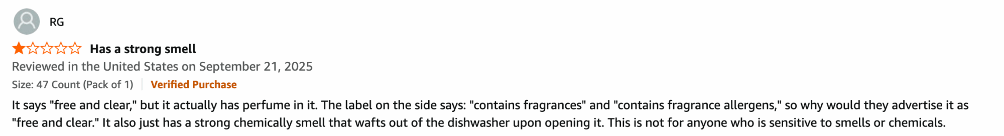 Others have left similar complaints on the dishwasher pods’ product page and Amazon listing asking why a product advertised as “free & clear” contains fragrance, which has a high allergen risk.