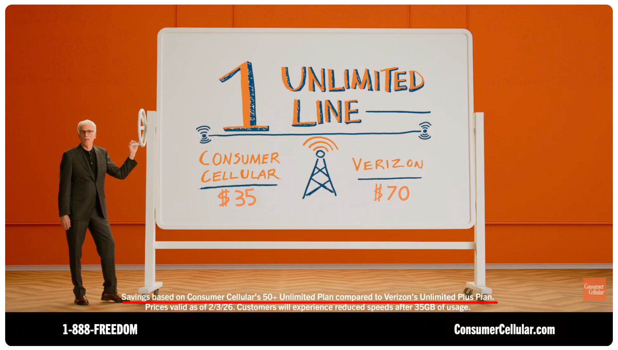 According to the ad, Consumer Cellular’s 50+ Unlimited Plan offers one line of unlimited talk, text and high-speed data for $35 a month or two lines for $60 a month, which are both half the price of “Big Wireless.”