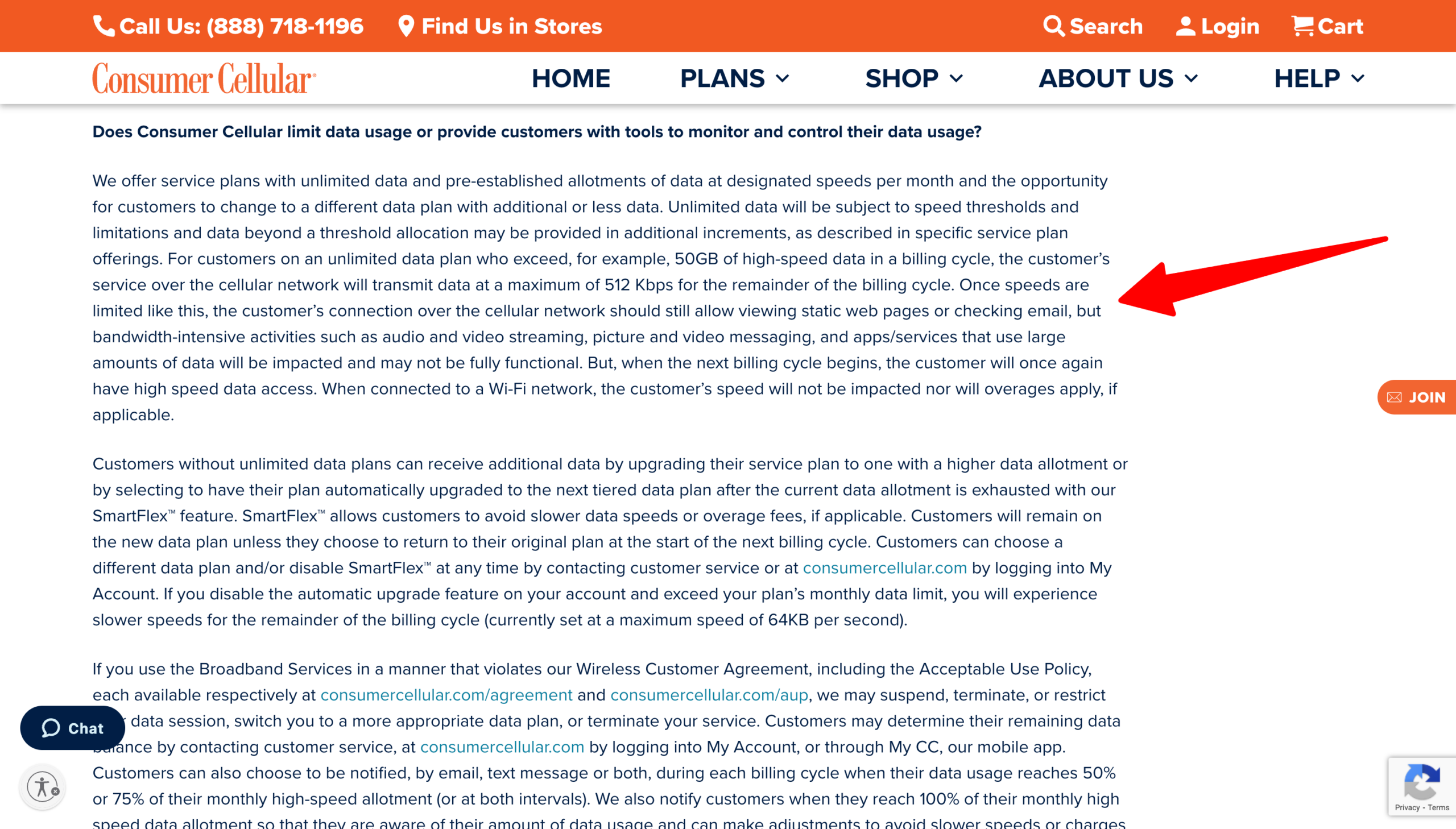 How much slower? The ad doesn’t say. But in terms linked at the very bottom of Consumer Cellular’s website, the company discloses that once consumers hit their data limit, they may not be able to stream, send pictures and videos, or use certain apps. Users should still be able to view static webpages and check email, the company says.
