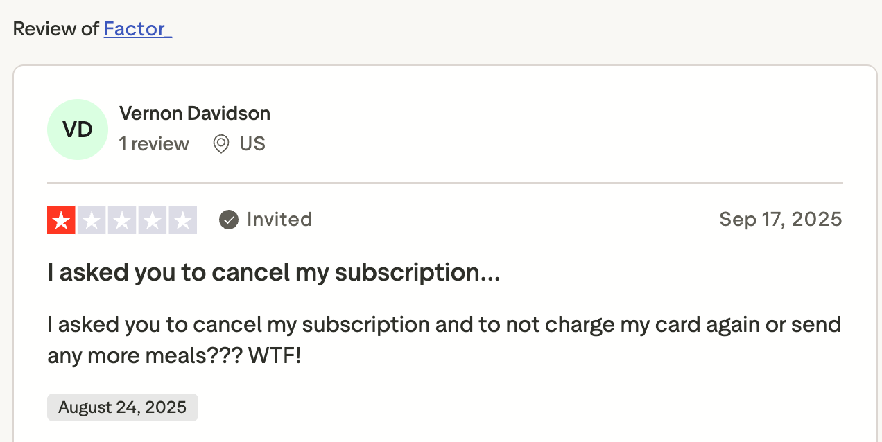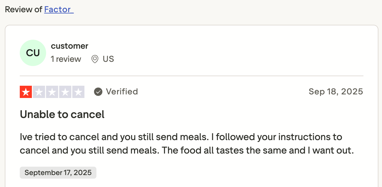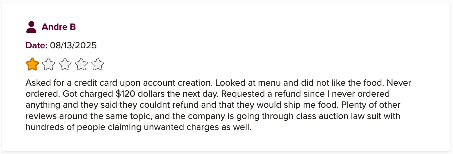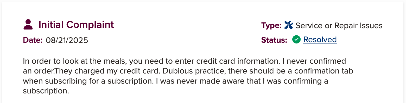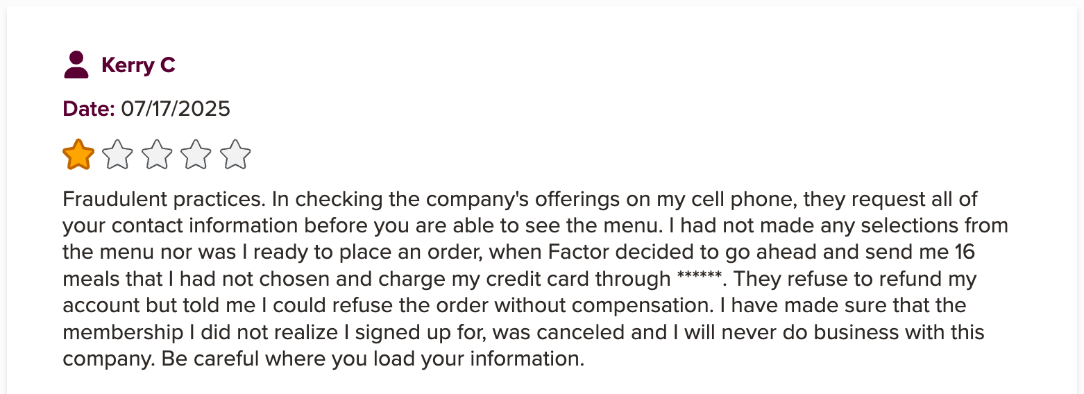 Perhaps unsurprisingly based on some of the meal kit company’s practices outlined above, consumers have complained about being charged without their consent and difficulties canceling Factor subscriptions, both of which would constitute violations of the FTC’s Restore Online Shoppers’ Confidence Act.