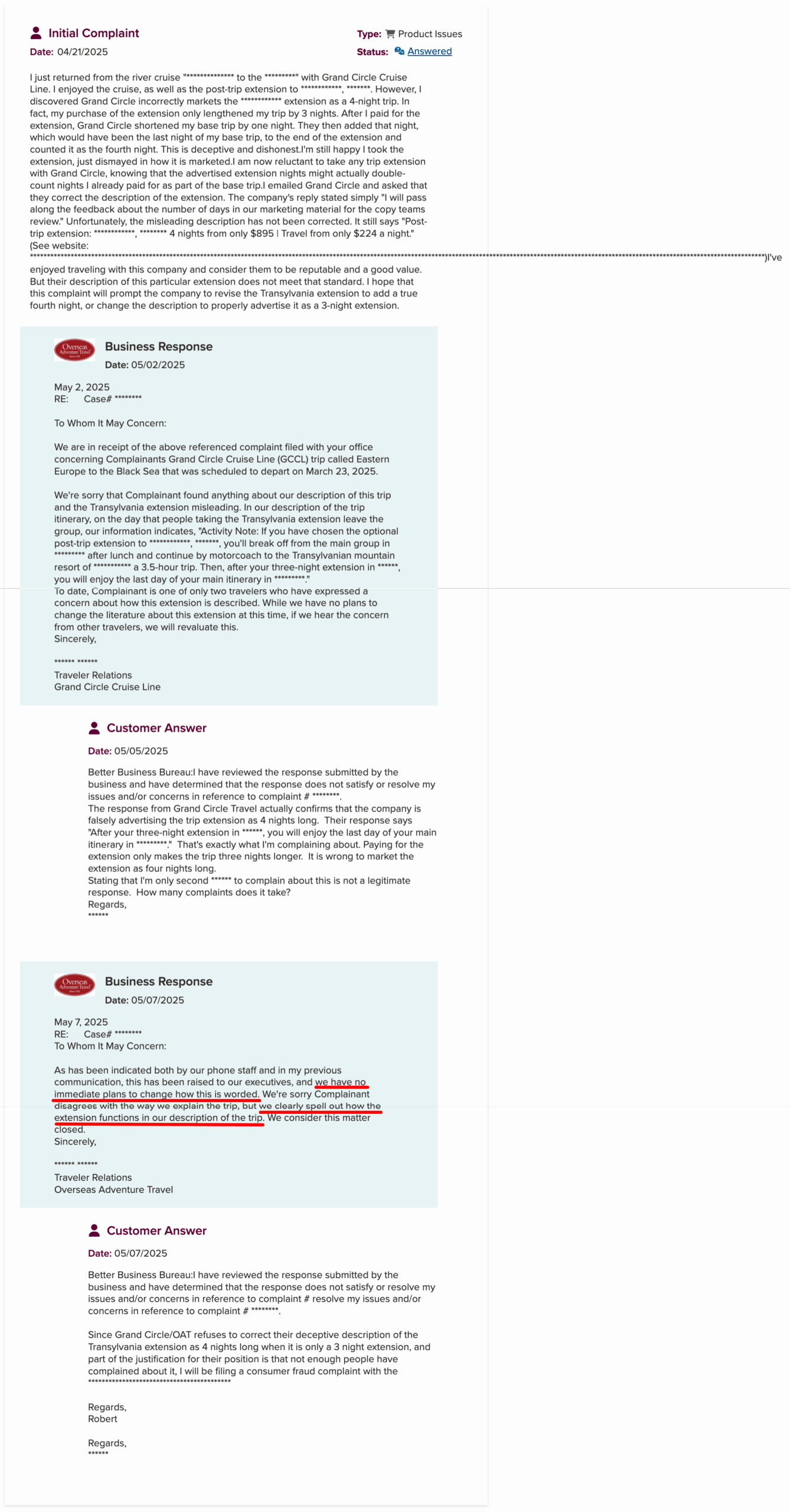 When this issue was raised in a complaint with the BBB, the company responded by stating that it had “no immediate plans” to change its marketing, arguing it “clearly spell[s] out how the extension functions in our description of the trip.”