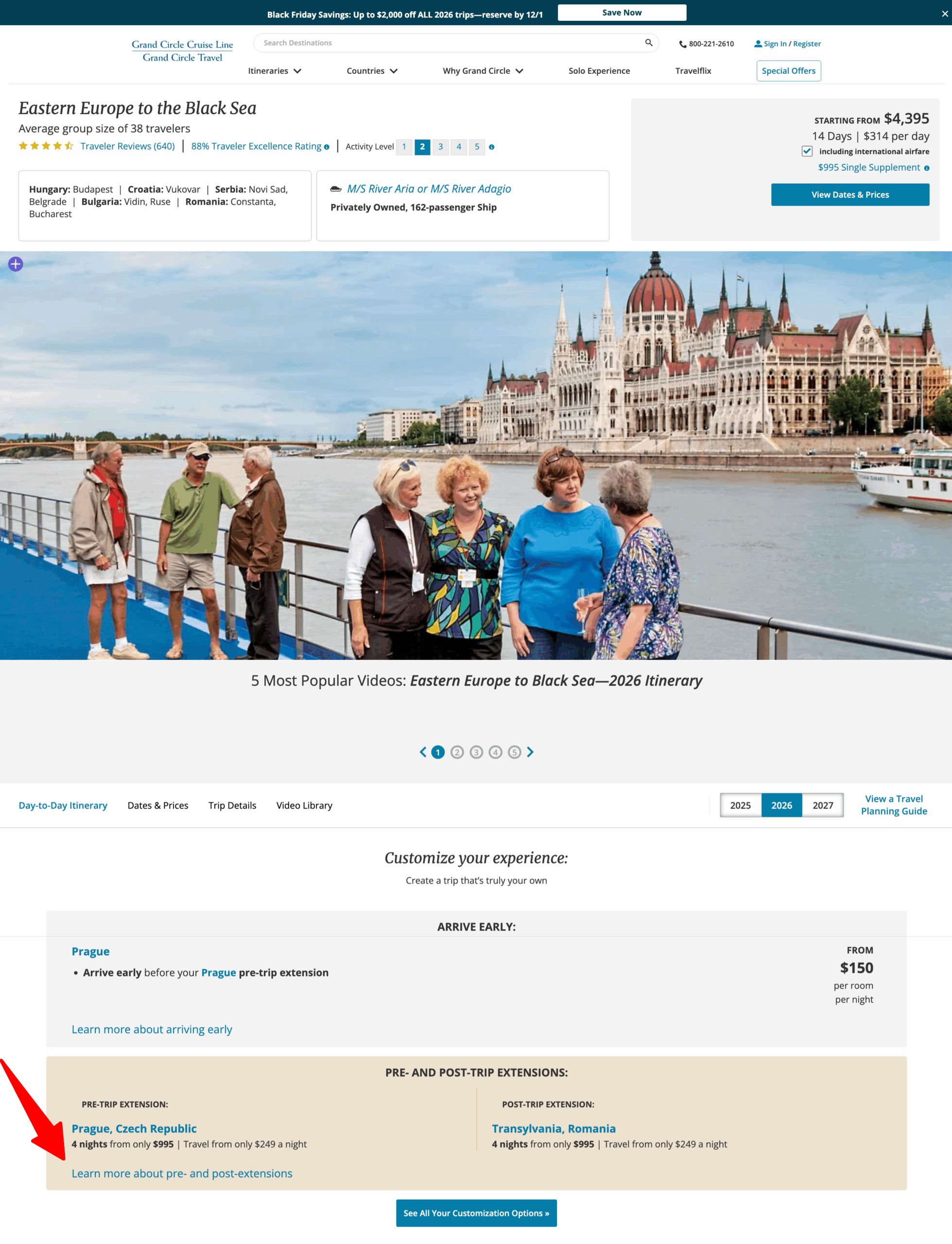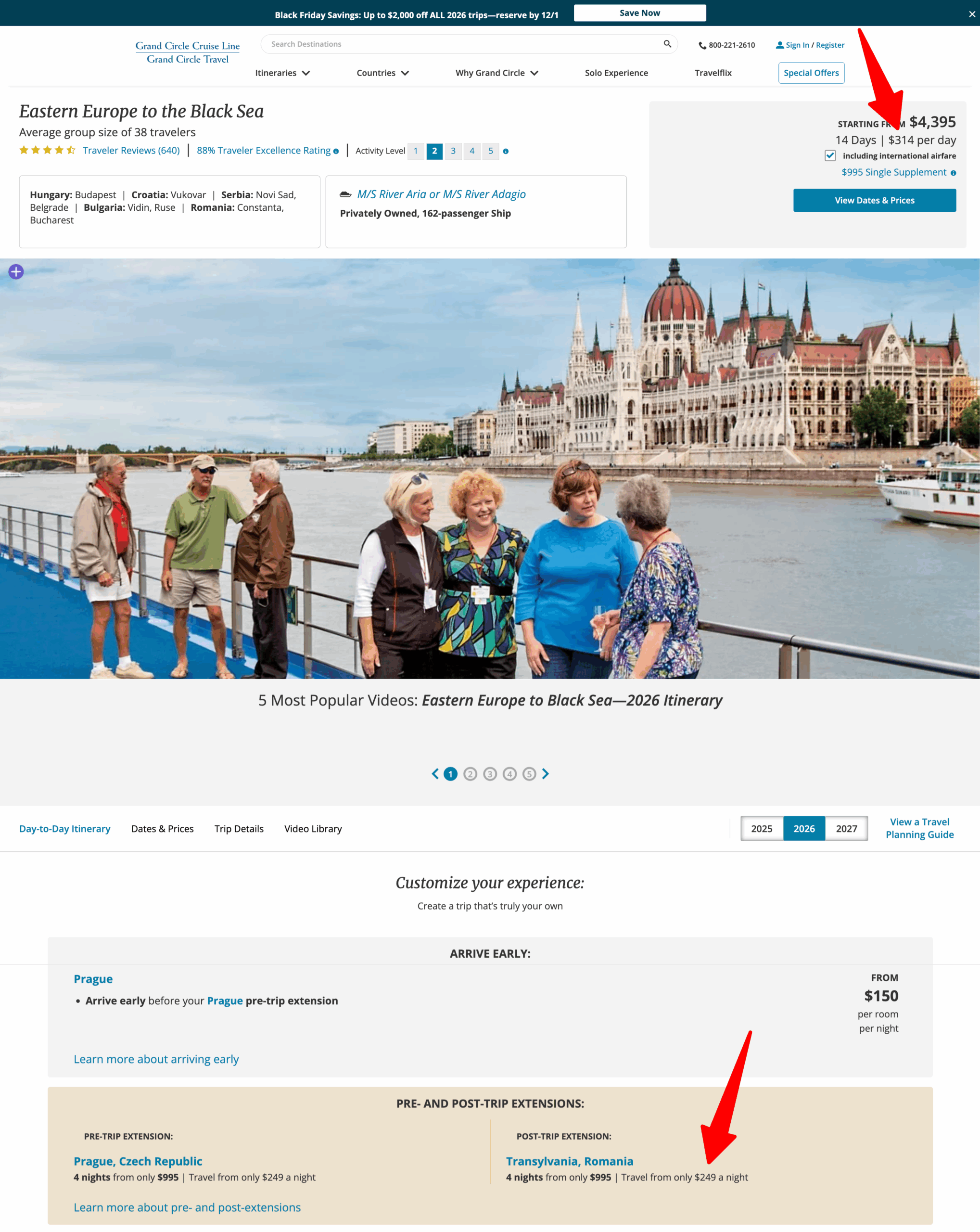 Our reader booked Grand Circle’s Eastern Europe to the Black Sea river cruise. On the trip’s main itinerary page, the company claims to offer a four-night extension to Dracula’s hometown of Transylvania, Romania, for a nightly rate $65 cheaper than the daily rate of the main 14-day trip.