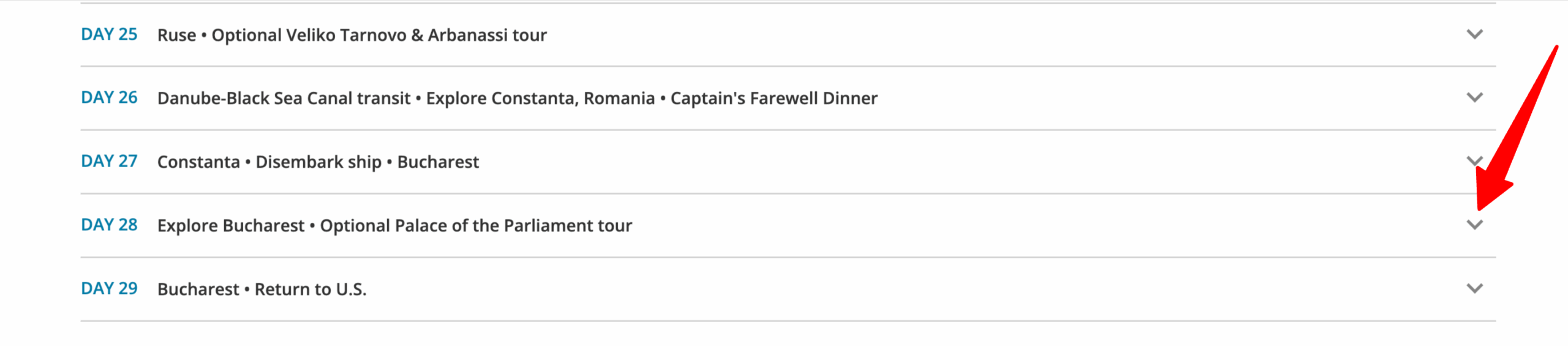 The company’s listing for its Grand European Cruise also advertises the four-night extension to Transylvania but clarifies on day 28 of the 29-day itinerary (which, again, consumers have to click on to open and read) that the extension is actually only three nights.