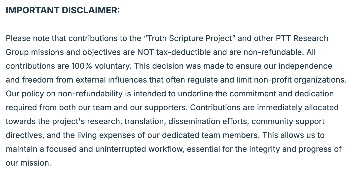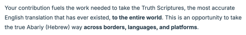 It is against this backdrop that Noland’s latest career – as a religious teacher and translator – must be understood. Noland’s Promote the Truth now positions itself as a corrective response to supposed distortions in traditional teachings of Christianity, with Noland once again casting himself as the authority with access to hidden or suppressed truths. Noland presents himself as someone restoring the “true” word and name of the Creator, YAHUAH, asserting that mainstream biblical texts are fundamentally flawed due to misinterpretations of languages in previous translations. The narrative and financial structure of Promote the Truth closely mirror Noland’s prior schemes, in which he positioned his offerings as exclusive (but costly) solutions unavailable through conventional channels. Central to this mission is the Truth Scriptures, a proprietary translation of the Bible that Noland claims is the “most accurate” ever produced, despite having no independent linguistic, scholarly or theological validation for his assertions.