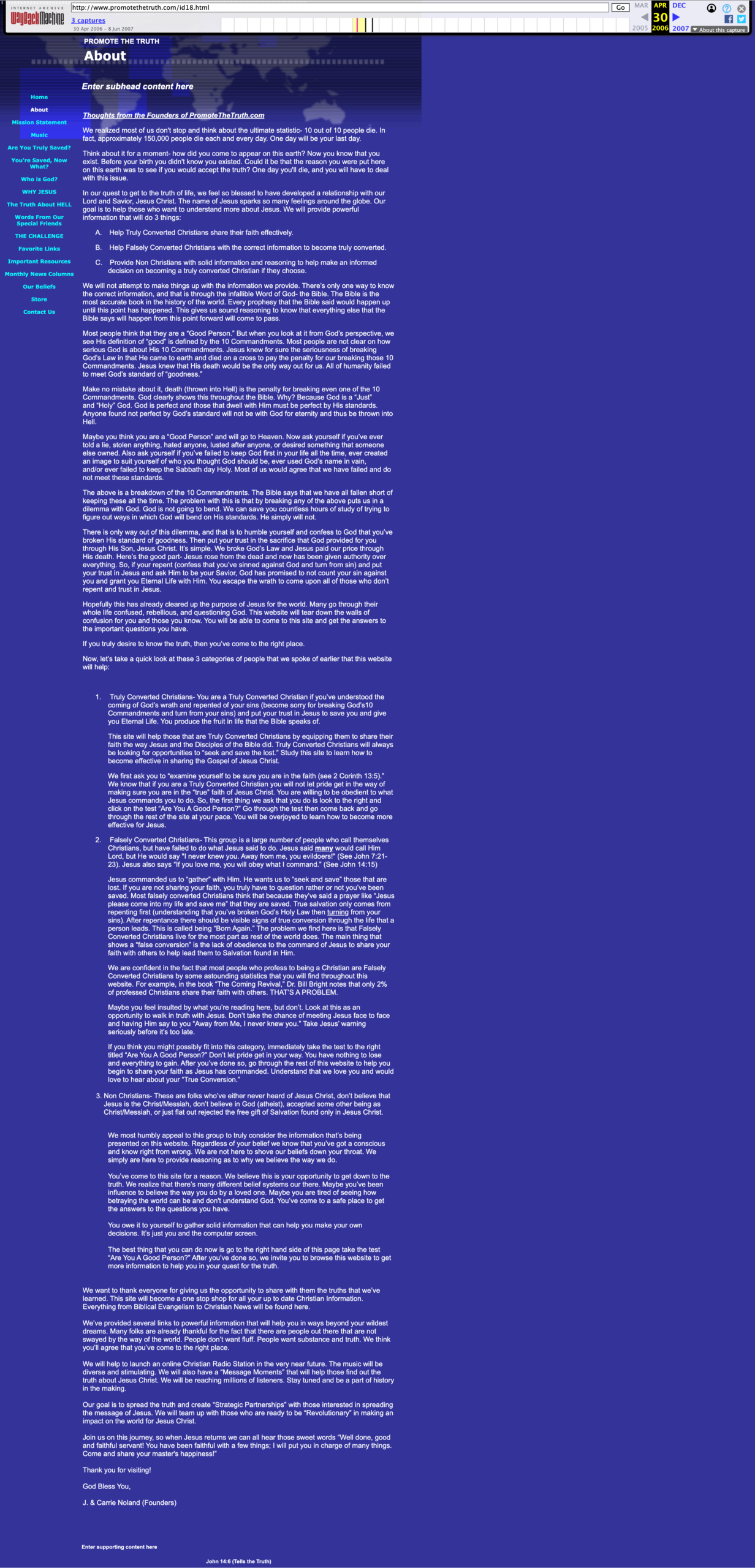 Notably, the origins of Promote the Truth, which was originally based in Florida but has recently been relocated to Manchester, England, also reflect a far more conventional Christian orientation than Noland now appears eager to embrace. Some 20 years ago, Noland and his wife used the Promote the Truth website to “spread the truth” and form “Strategic Partnerships” with individuals interested in disseminating the message of Jesus.