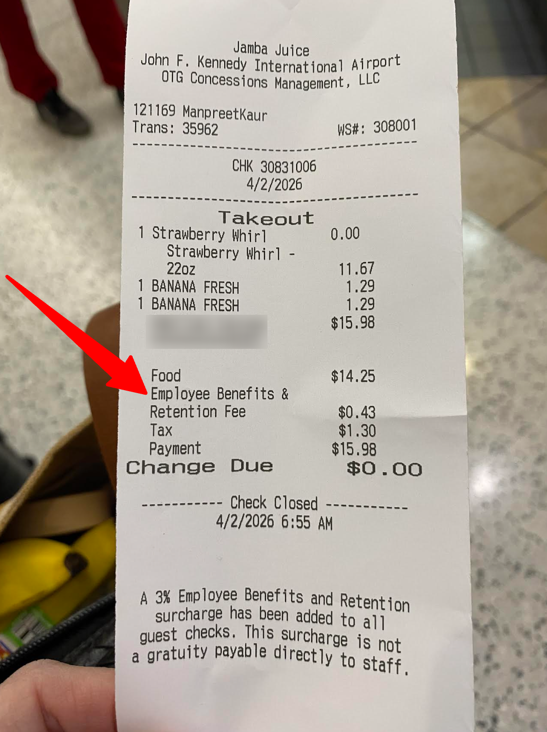 After recently surviving the hours-long lines at New York’s JFK International airport, a TINA.org staffer decided to celebrate with some Jamba Juice. But before she could take the first sip of her Strawberry Whirl smoothie, she discovered an “Employee Benefits & Retention Fee” on her receipt that was not disclosed prior to ordering.
