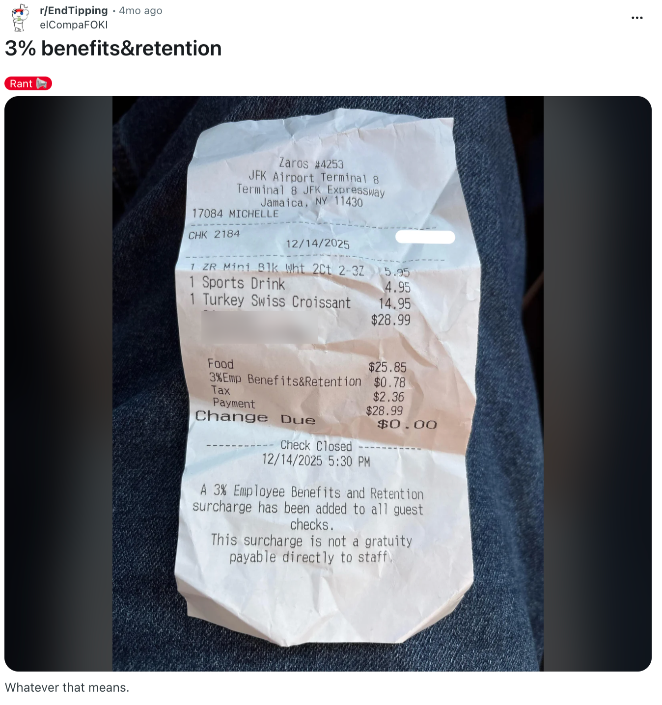 The receipt explains the hidden fee at the bottom, stating that a “3% Employee Benefits and Retention surcharge” is added to all orders, and while it supposedly benefits the staff, it is not a tip.
