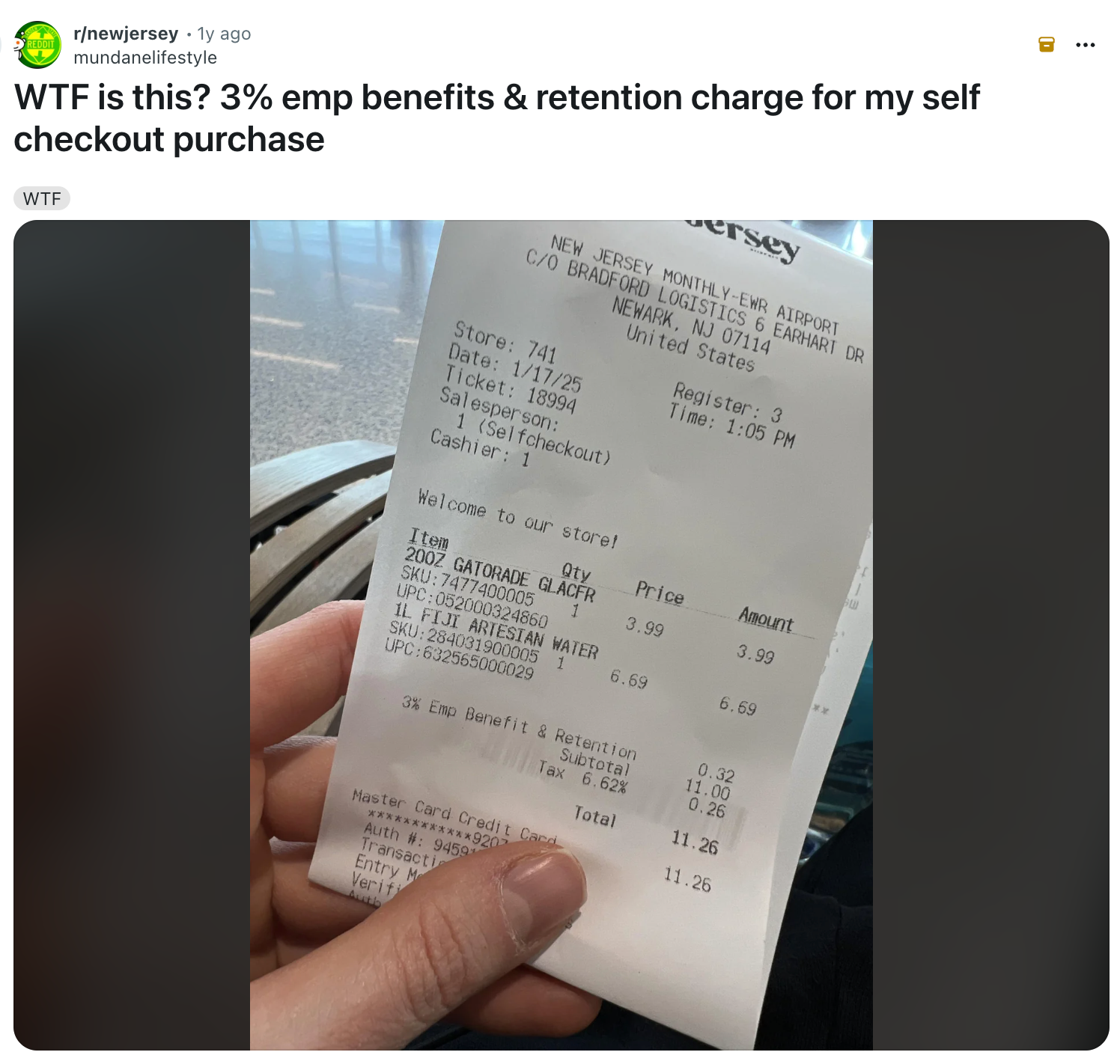 On Reddit and Facebook, consumers have reported that multiple different businesses at New Jersey and New York airports charge this same surprise fee.
