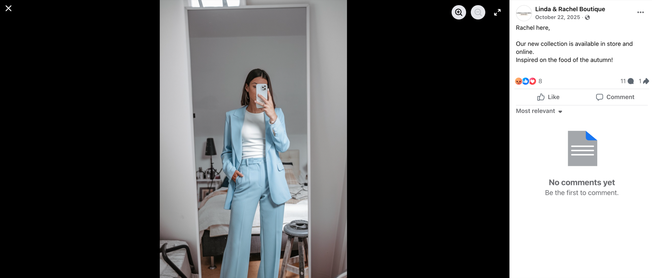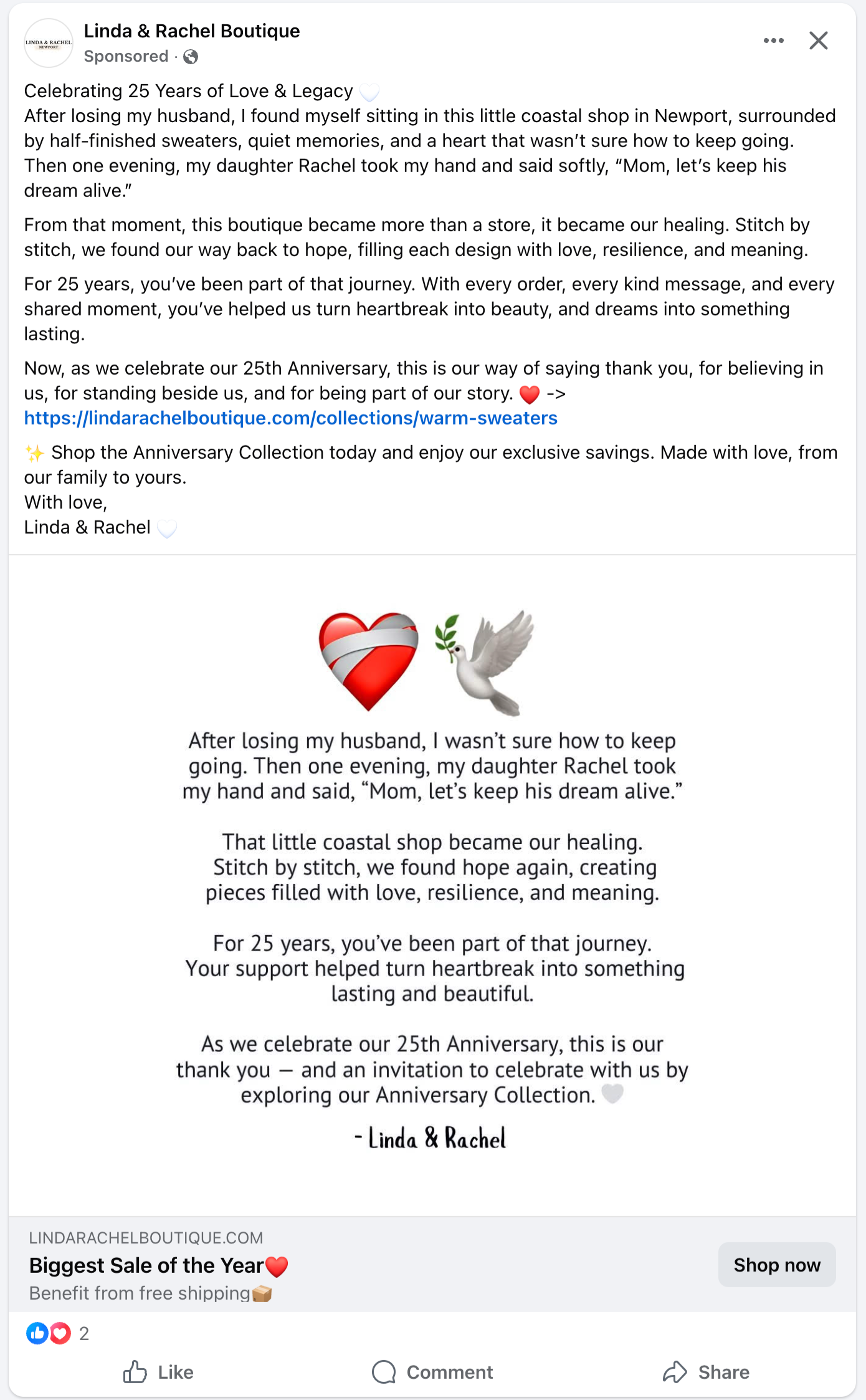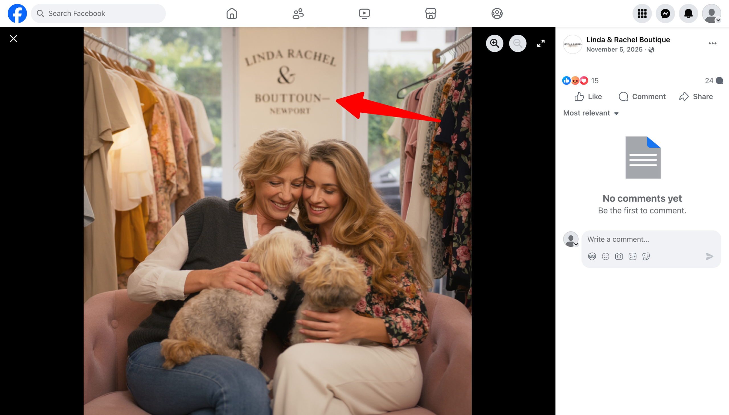 Images on Linda & Rachel’s website and Facebook page have some notable issues, including contrasting images used for its purported co-owner Rachel and a cover photo that misspells its own shop name. Of note, misspelled words in images are a sign that AI was used to generate them.