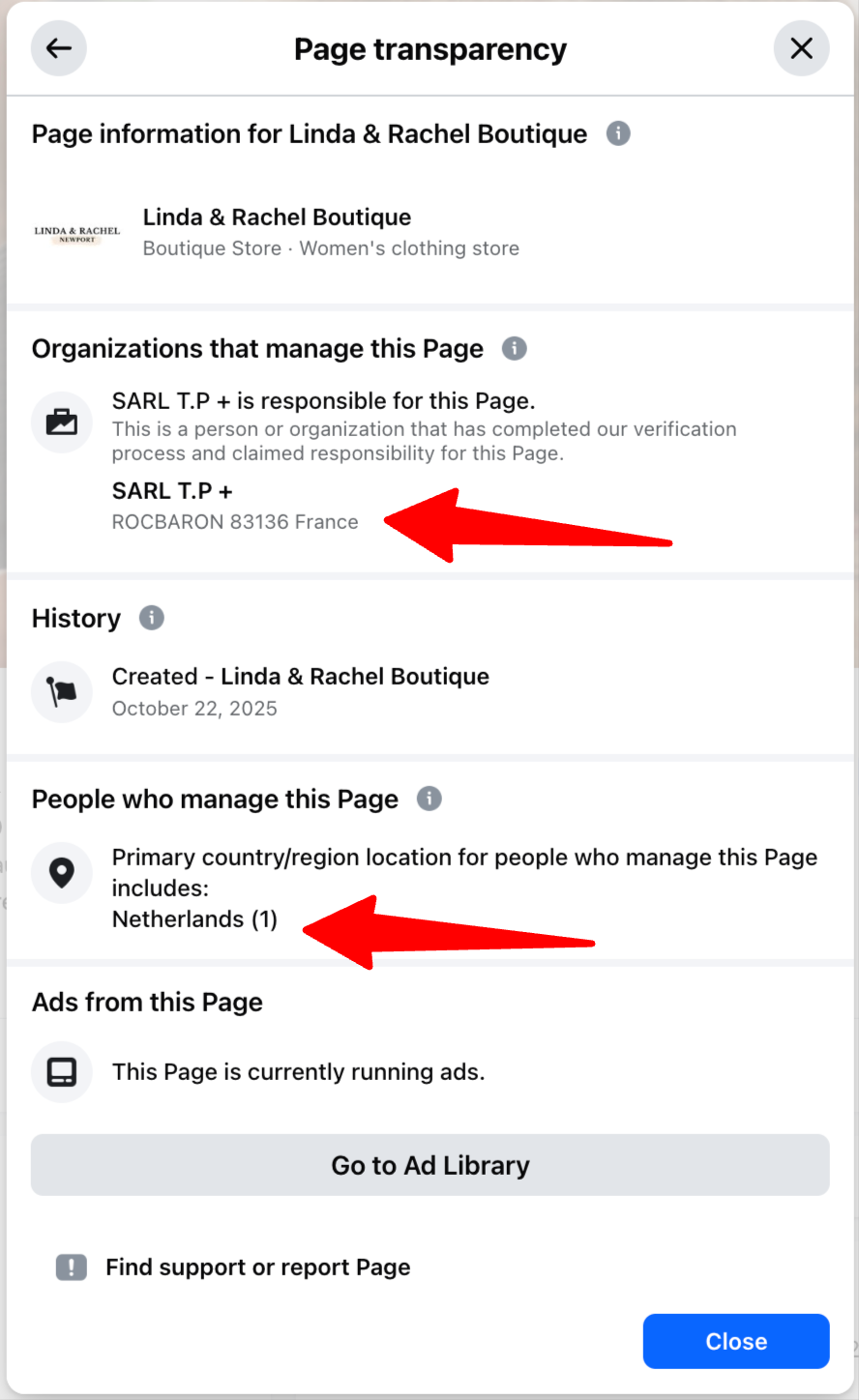 Additionally, TINA.org found a surprisingly large global footprint for this “local” boutique including a Facebook page managed from overseas, products that come from China and website URLs that contain foreign languages.