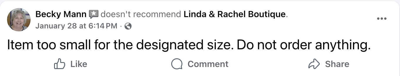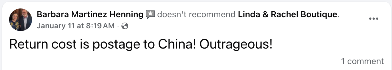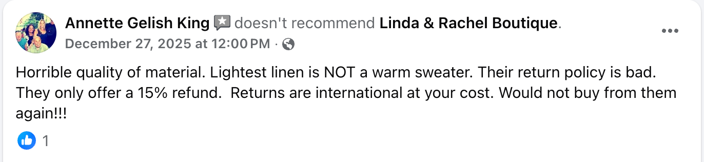 Speaking of reviews, consumers have reported a multitude of issues with Linda & Rachel with the BBB and on the company’s Facebook page citing products that did not match the quality represented on the website, an onerous return process that requires shipping items to China, and more.