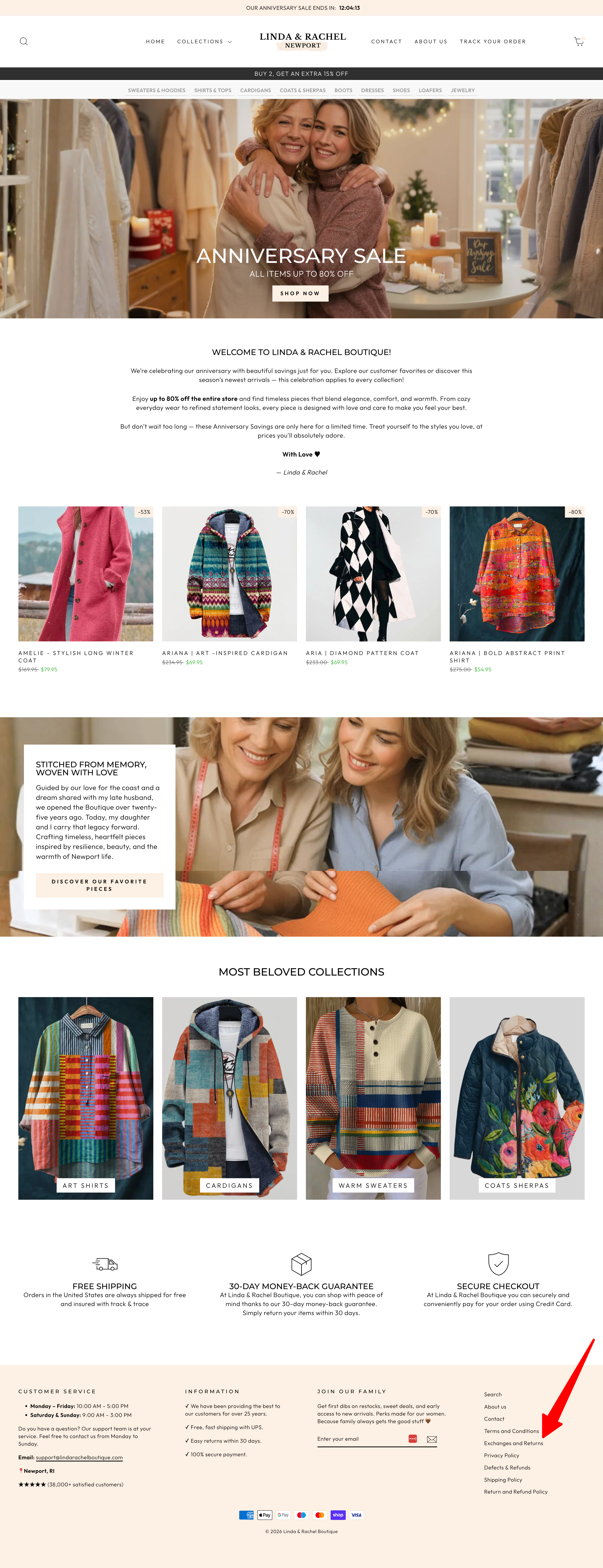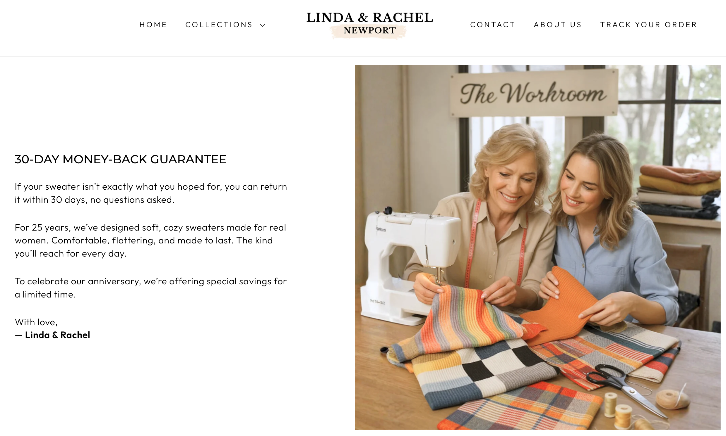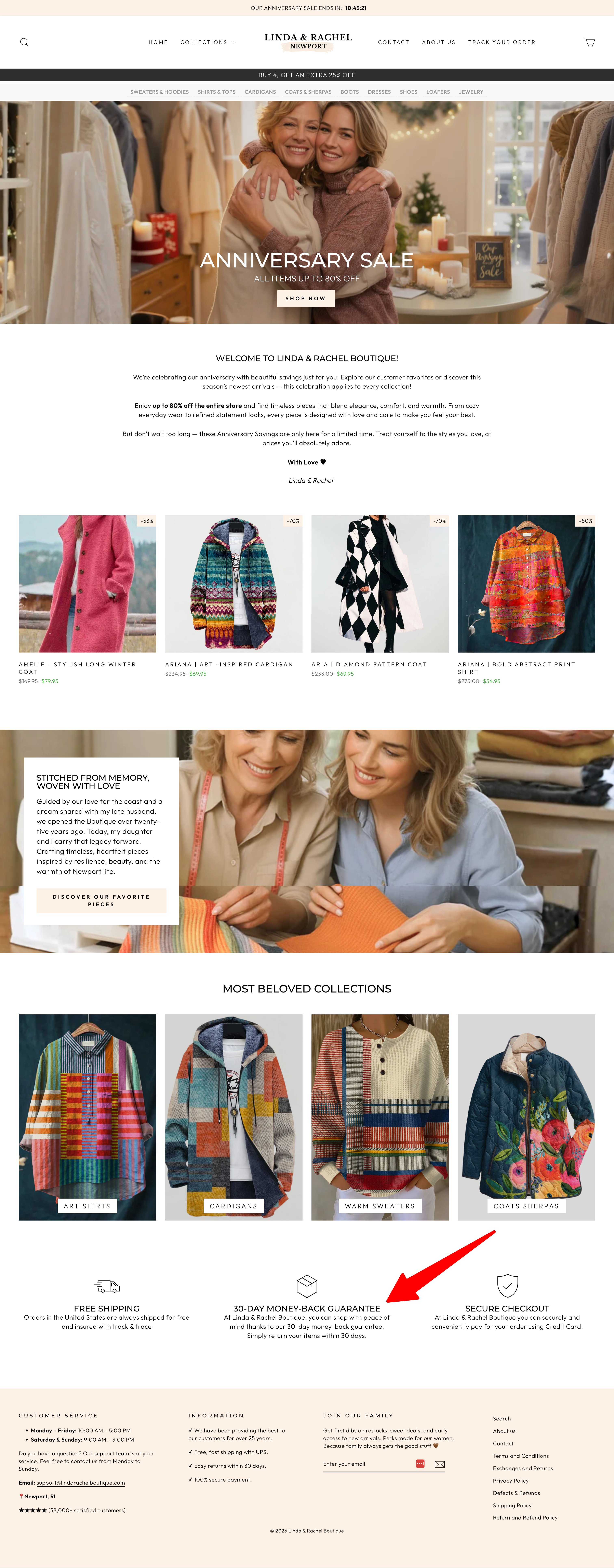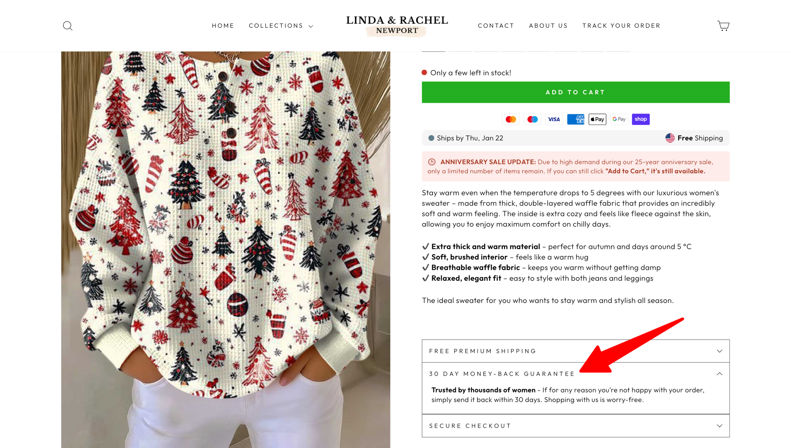 On its homepage, Linda & Rachel claim its customers can “shop with peace of mind thanks to our 30-day money-back guarantee.” This message is reiterated on product pages where the company claims this guarantee is “no questions asked” and can be used for “any reason.”