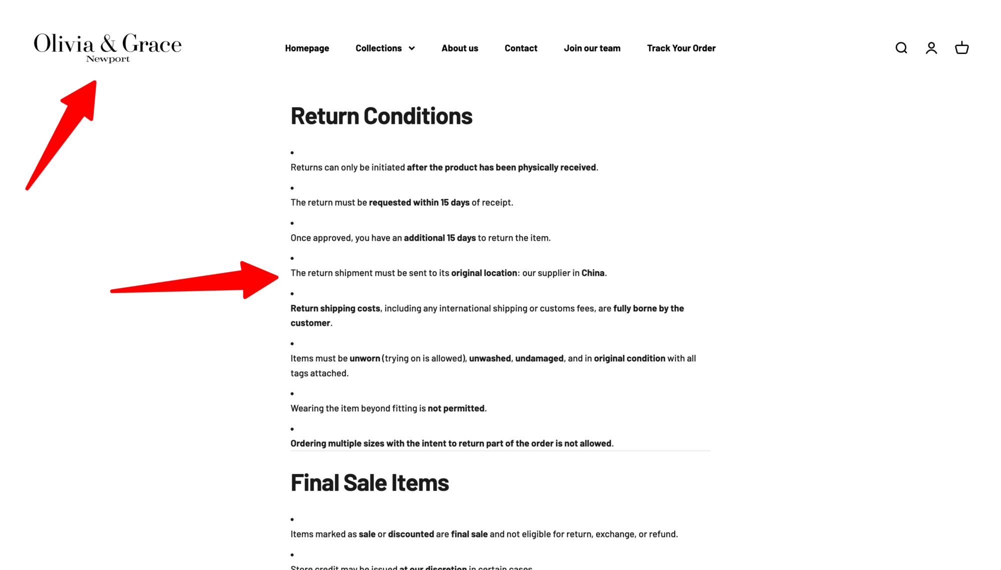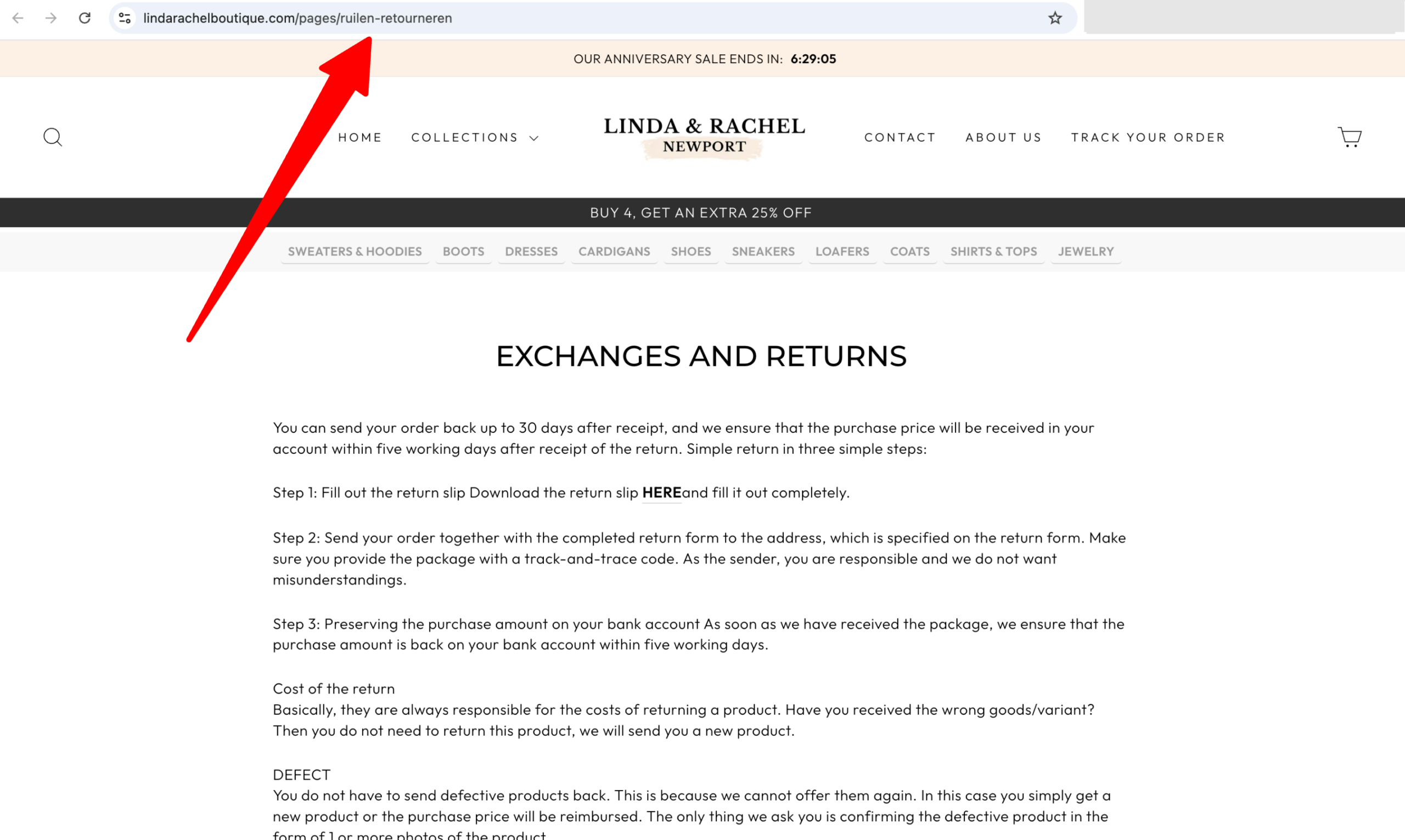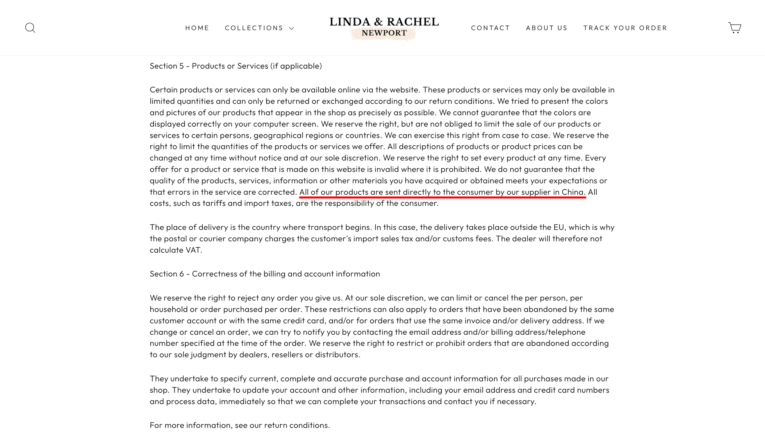 A little digging reveals that Linda & Rachel’s return policy (linked at the very bottom of its website) states that consumers are “always responsible” for return shipping. But the policy doesn’t say how expensive return shipping will be or that the products will have to be shipped internationally. The only mention of a return location is the following mysterious message: “You will receive the return address from us as soon as you have registered your return.”
