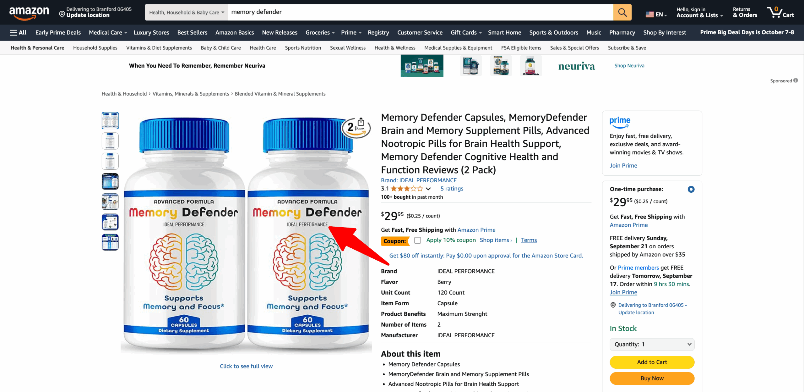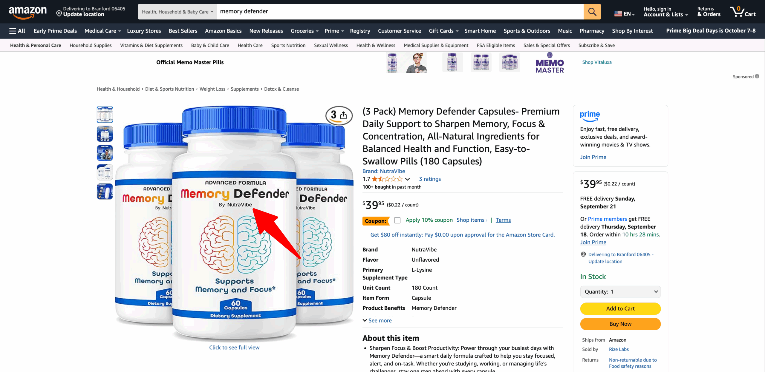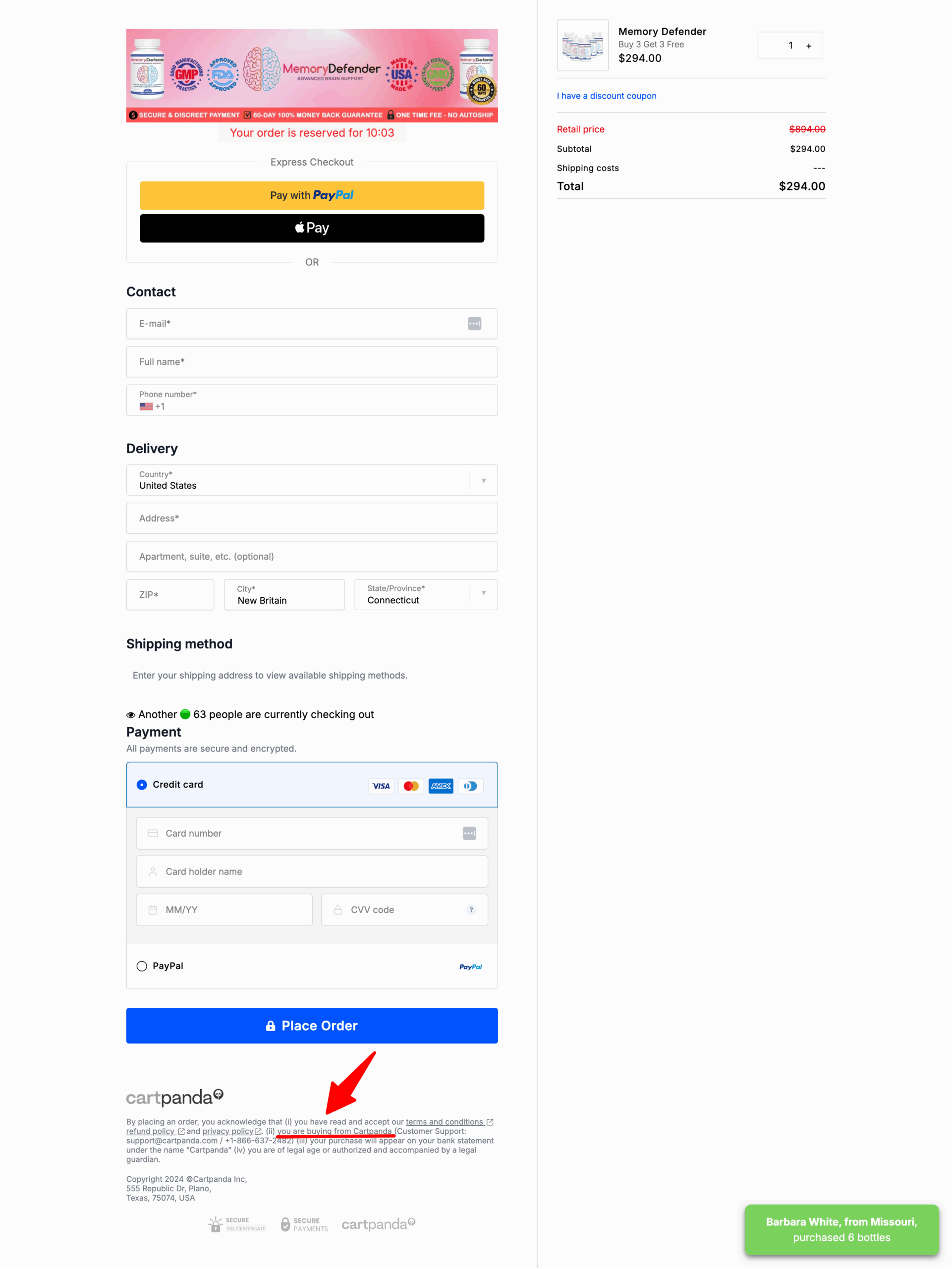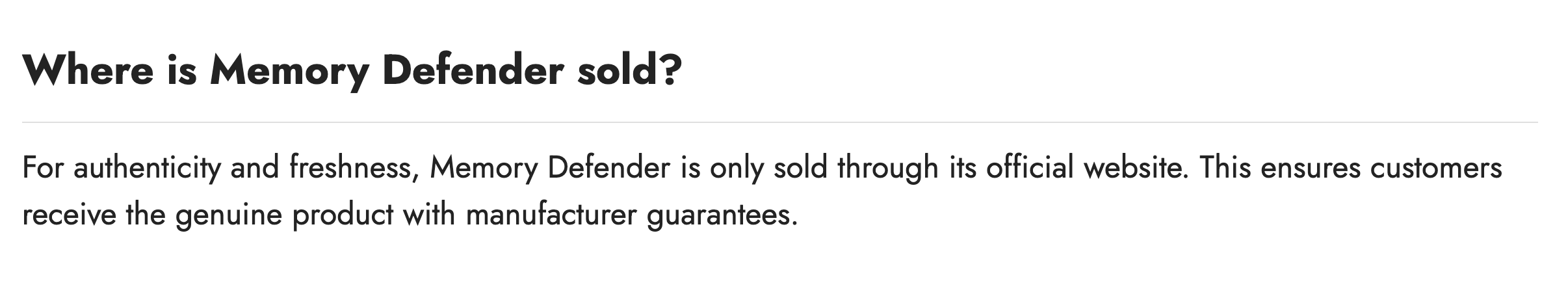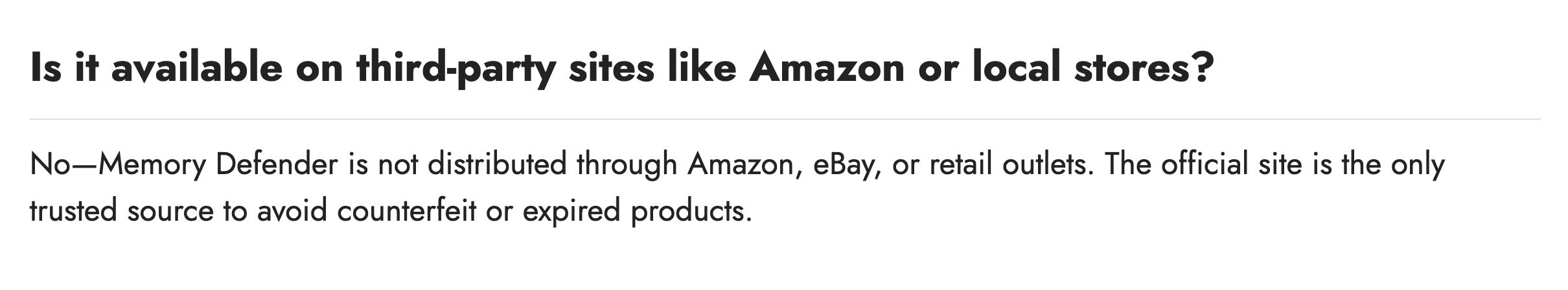 The video claims that “Memory Defender is only available through this official page” and you won’t find the supplement “anywhere else.” However, there is no mention in the video of who actually manufactures Memory Defender or of the brand associated with the supplement. A disclaimer on the checkout page informs visitors that they are purchasing the supplement “from Cartpanda,” an e-commerce platform. Meanwhile, Amazon listings for purported Memory Defender products show a number of different brands on the bottles themselves including Ideal Performance, Livorka and NutraVibe.