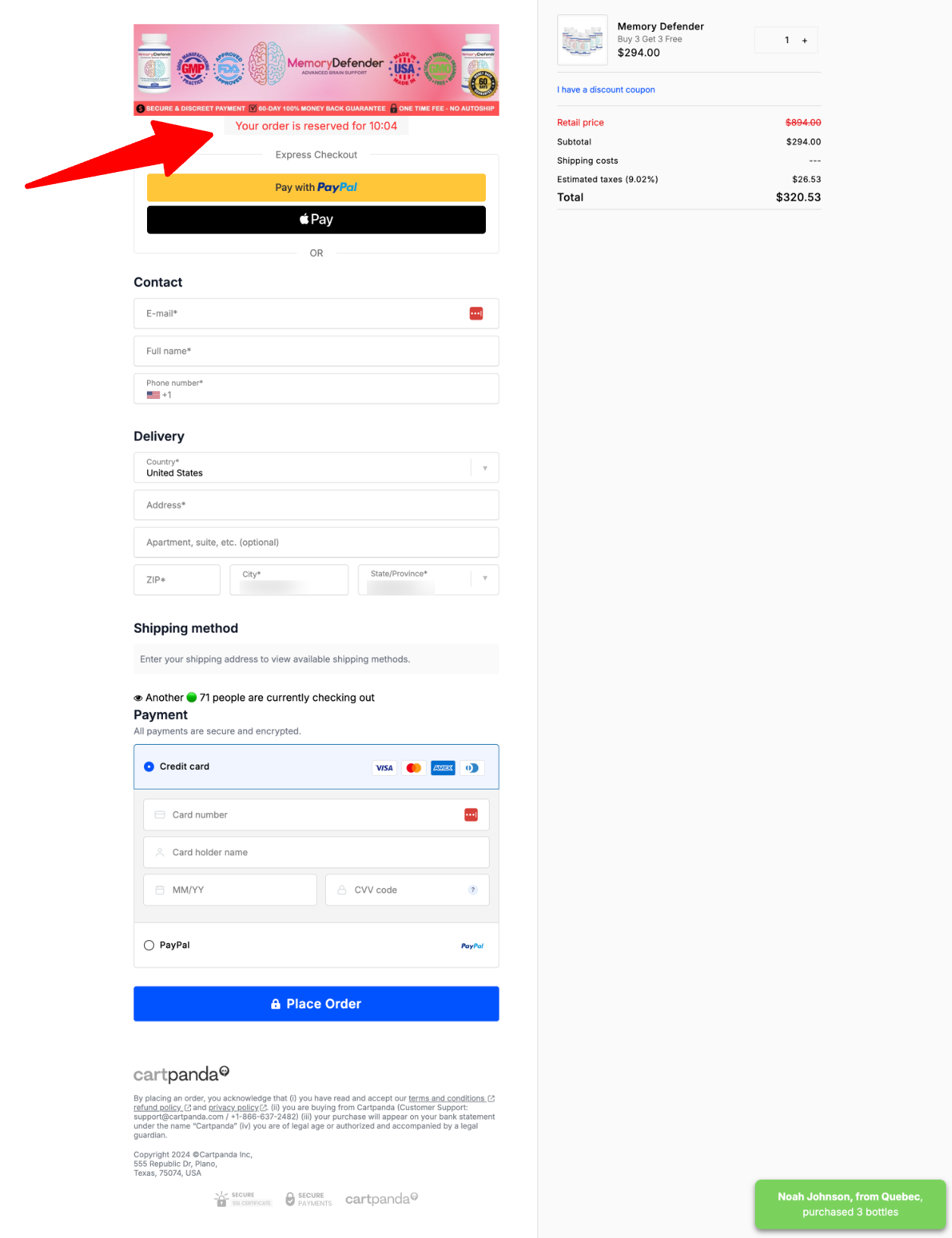 These deceptive tactics include falsely claiming that there are only 79 bottles of Memory Defender left in stock, which decreases to 27 bottles in the span of a couple minutes. Then, once consumers get to the checkout page, they are greeted with a countdown clock telling them that their order will only be reserved for about 10 minutes. But once the timer expires, the order/offer is still available.