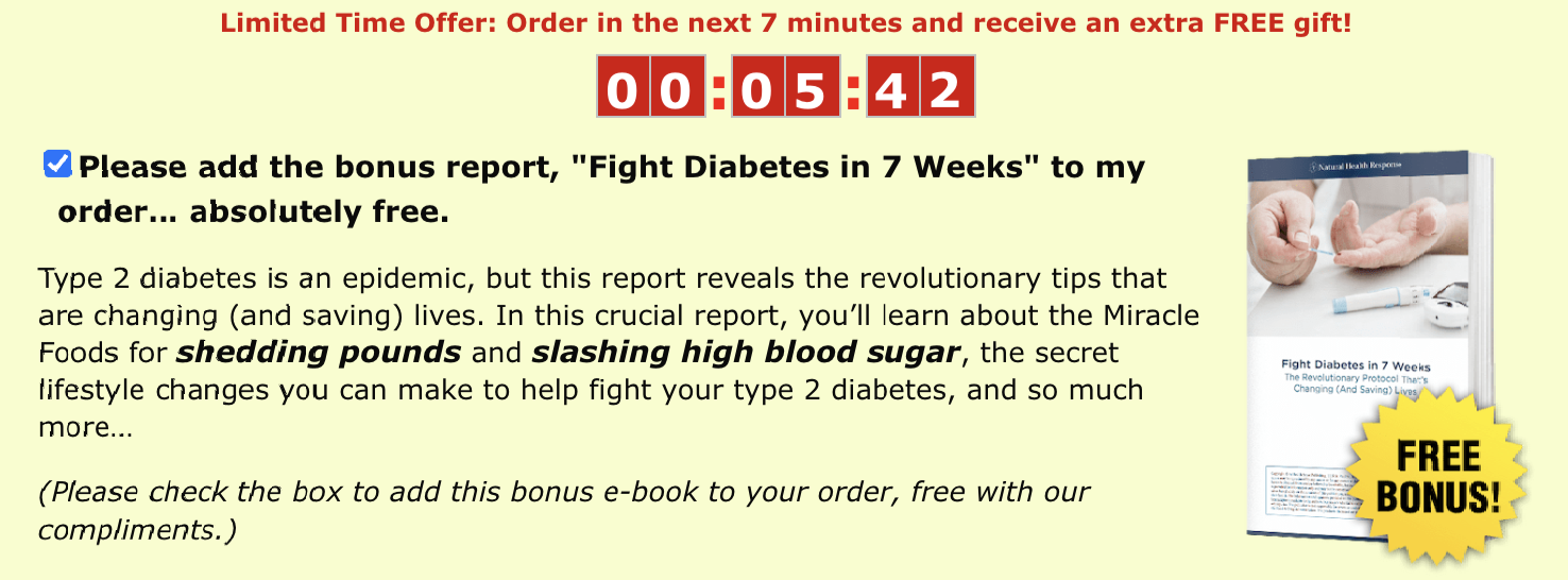 As part of our order, we also signed up to receive a bonus report called “Fight Diabetes in 7 Weeks” that claimed to reveal “the revolutionary tips that are changing (and saving) lives.” The physical report never arrived in the mail but a digital version was immediately available after subscribing to Natural Health Response. And the “revolutionary protocol”? It simply amounts to following a low-carb diet.