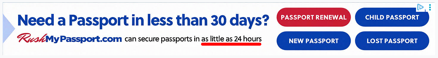 UPDATE 1/30/26: Following our inquiry, RushMyPassport now claims on its website that it expedites passports in “as little as 3 business days” instead of in “as little as 24 hours,” though the company continues to advertise the 24-hour timeline outside its website. Our original ad alert follows.