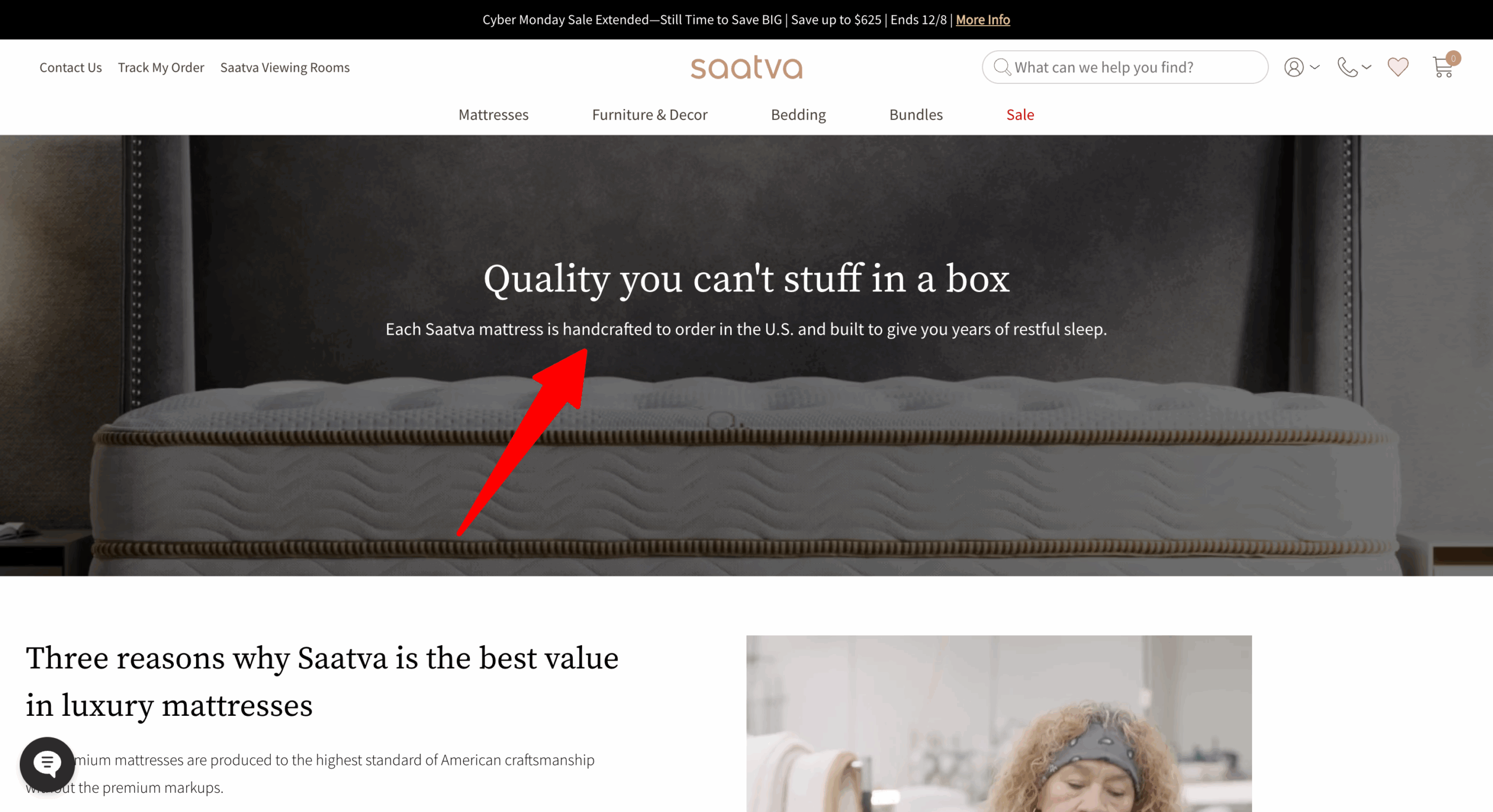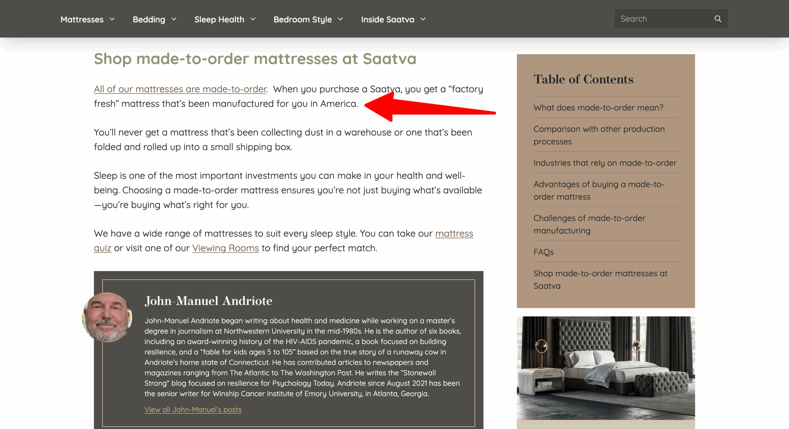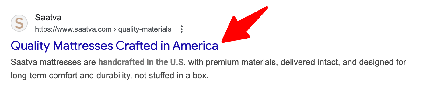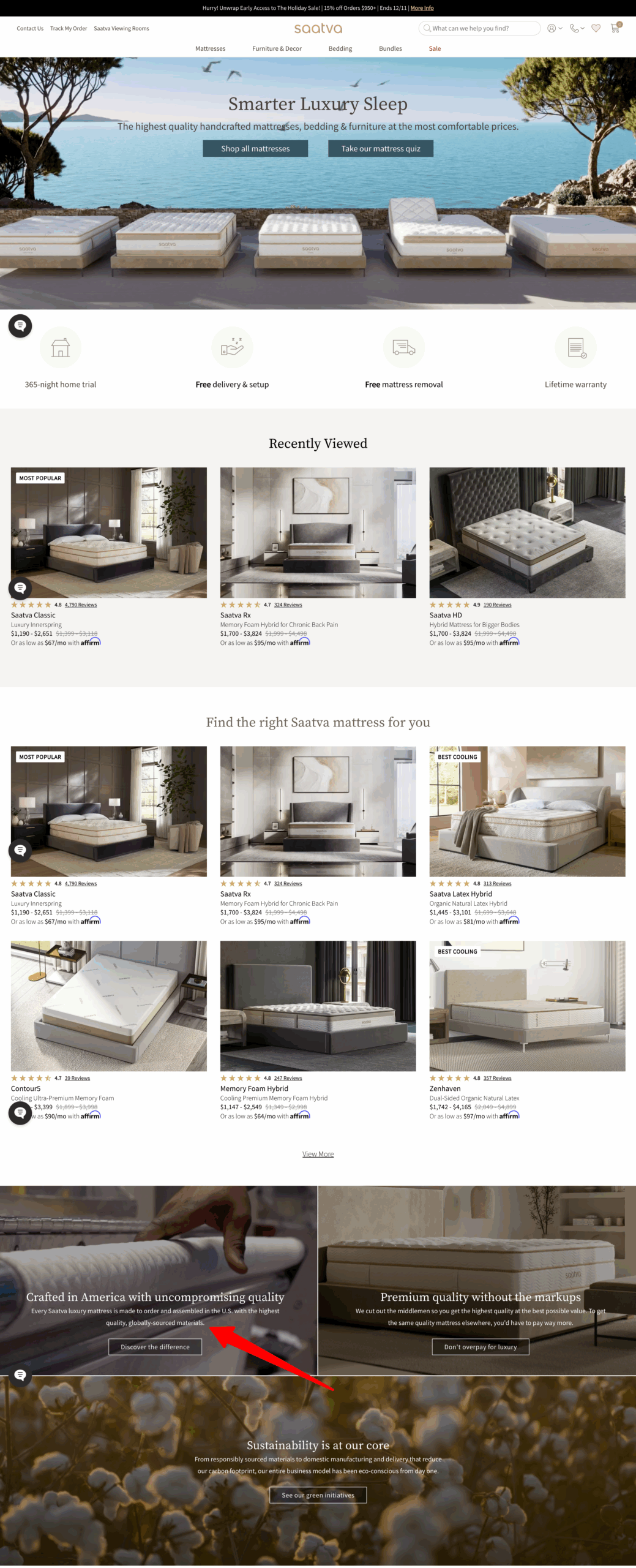 Enter Saatva, a bedding company that claims in the TV commercial above that its mattresses are “handcrafted and assembled in American factories.” The company doubles down on its USA marketing in Google search results, as well as in various sections of its website, stating that its mattresses are “Crafted in America,” “handcrafted to order in the U.S.,” “produced to the highest standard of American craftsmanship,” “Crafted in the U.S.A.” and “manufactured for you in America.”