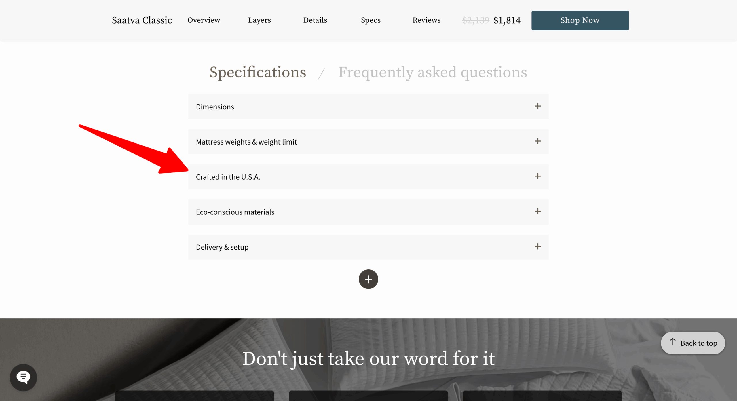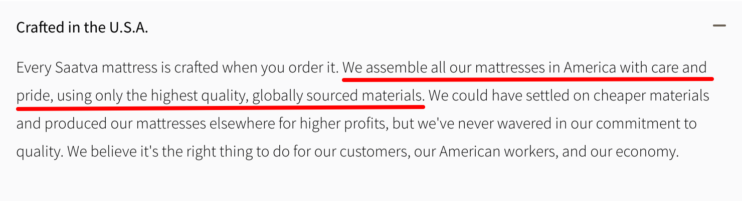 That’s not the case with Saatva’s mattresses. As the company inconspicuously discloses on its homepage and in the specification sections on product pages (see below), its mattresses are actually only assembled in America using globally-sourced materials.