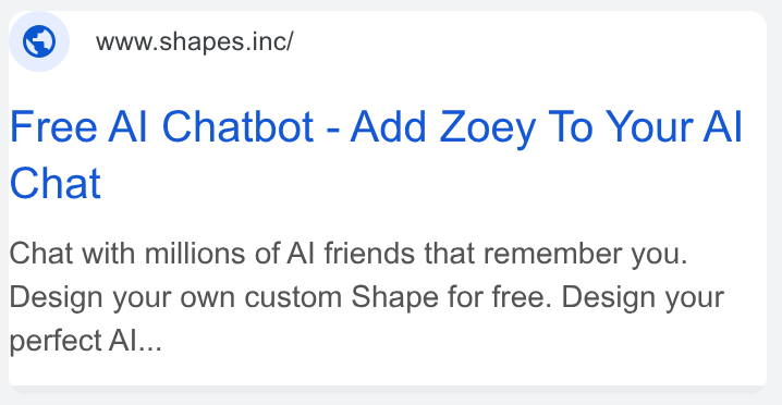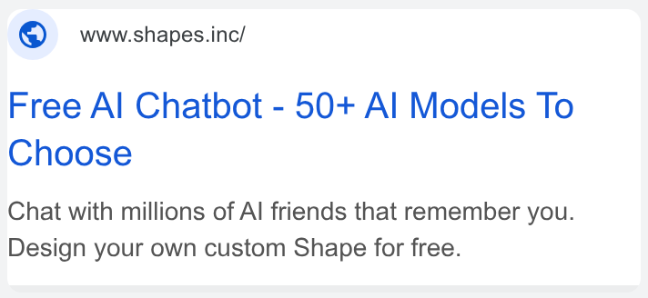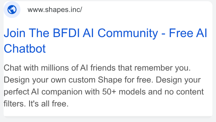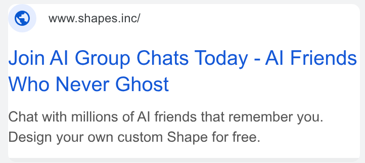 In Google ads, Shapes.inc – an online platform with AI chatbots – claims that it offers “unlimited freedom” to create your own virtual friends that will “never ghost” you. According to the ads, the platform offers over 50 different AI models to generate your chatbot and “it’s all free.”