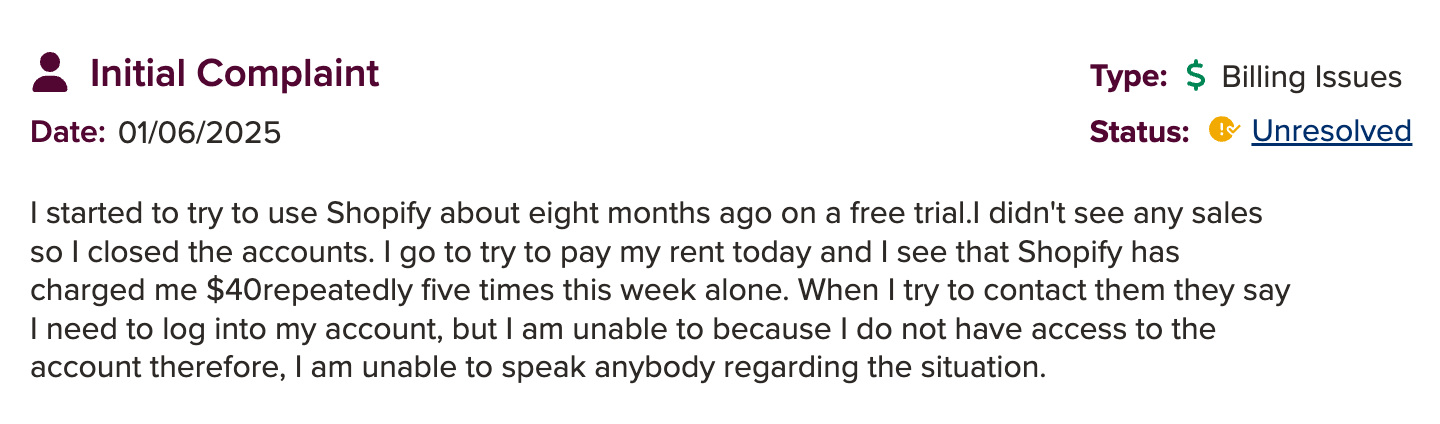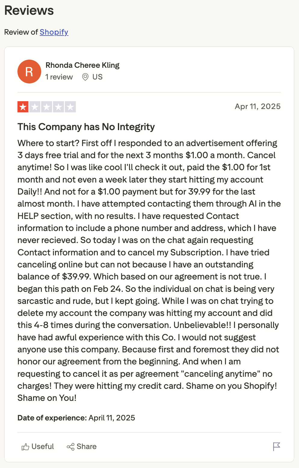 But if you do hand over your credit card information, you may find it hard to cancel your subscription, according to a number of consumers who have signed up for Shopify’s free trial. This, despite the company’s claim that you can “cancel anytime.” In addition, some consumers report being charged full price before the three months is up.