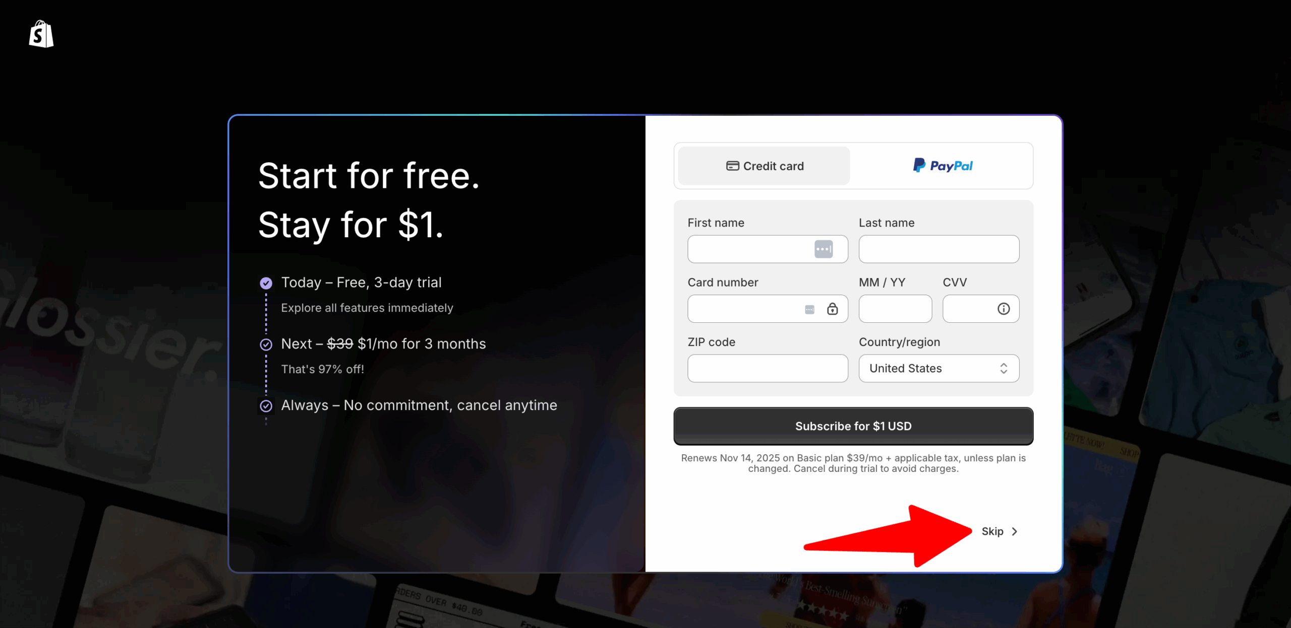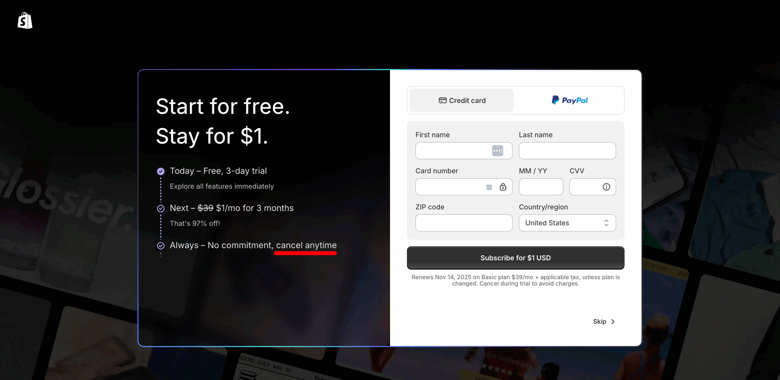 The only way for consumers signing up for the free trial on Shopify’s website to avoid any subscription fees is to click on an inconspicuously placed “skip” button, which is the less visible option to entering your credit card information to “Subscribe for $1” following the free trial. But then you only have three days to try Shopify. Given the nature of the company’s products, which include a website builder, that doesn’t seem like sufficient time to find out whether you want to become a paying customer or not.