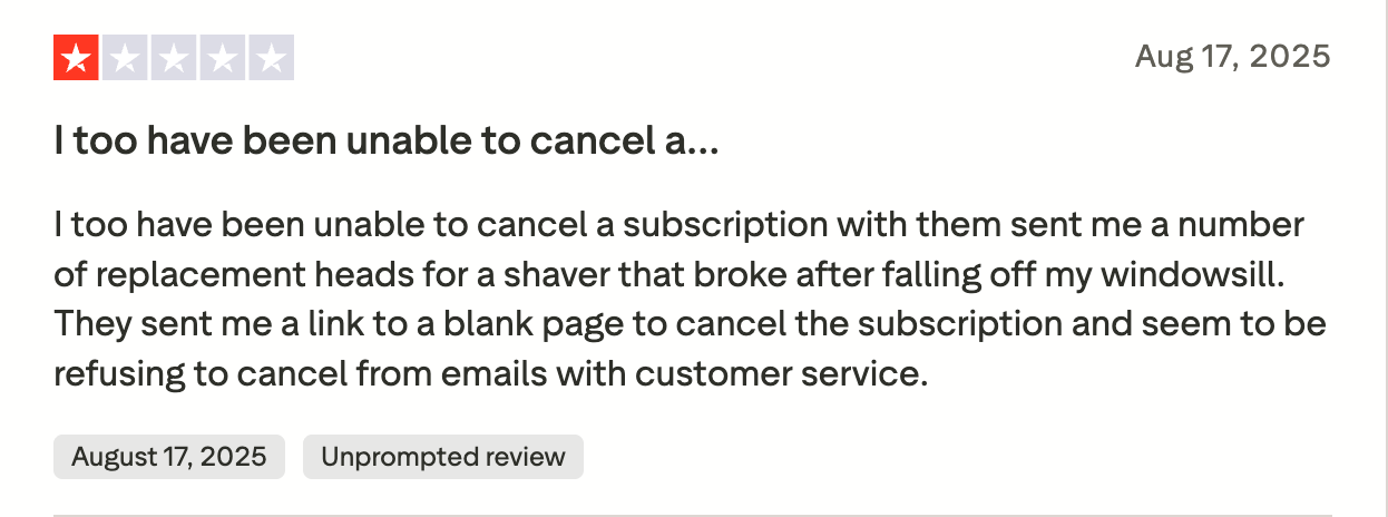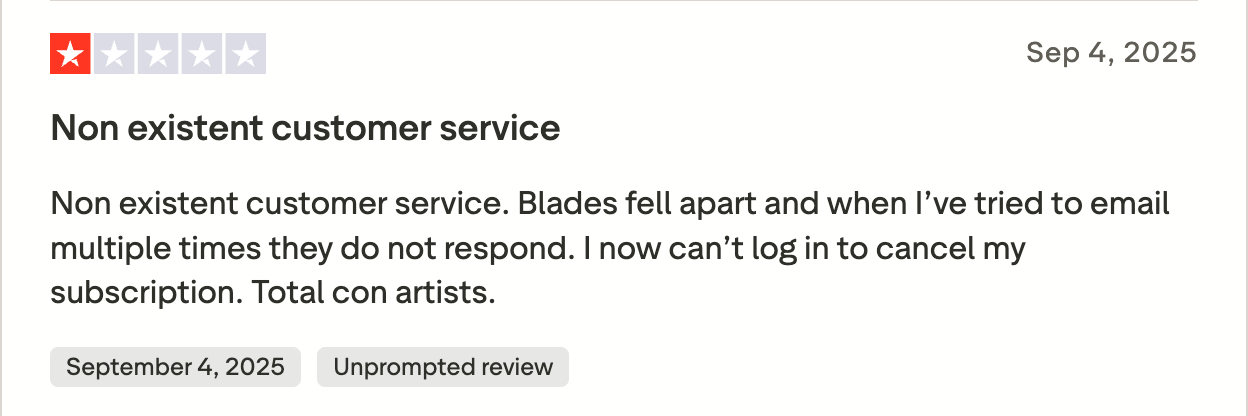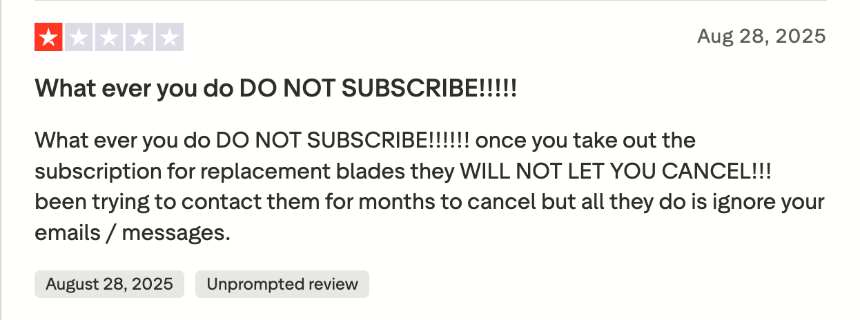 And, despite Skull Shaver’s claim that you can cancel the replacement blades subscription “anytime,” consumers have reported on Trustpilot that the company makes cancellation far from a smooth process.