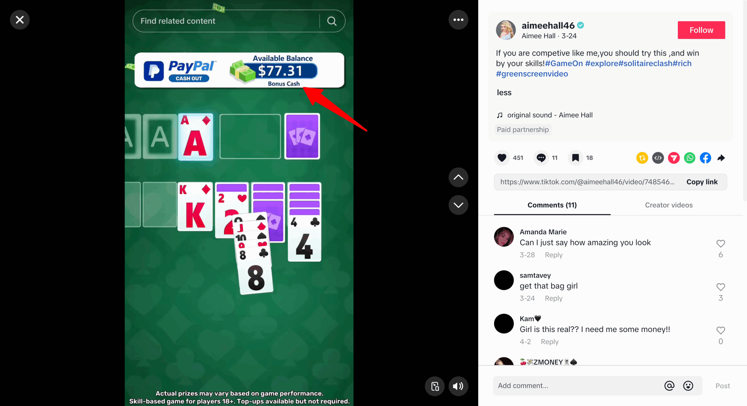 TikTok influencer posts for the mobile game Solitaire Clash show TikTokers seemingly racking up lots of cash in real time.