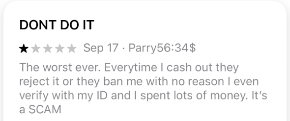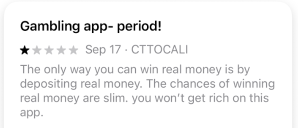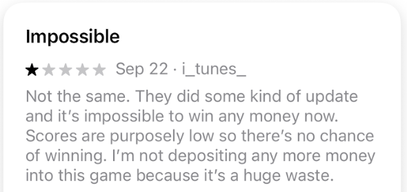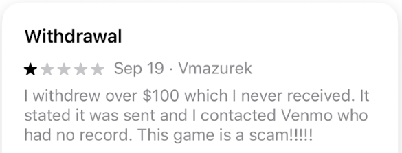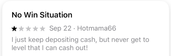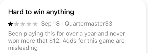 And, of course, in order to withdraw any money, you first need to win some, and according to some consumer reviews on the Apple App Store, your chances of winning real money are somewhere between “impossible” and “slim.” Even those who reportedly have won money playing Solitaire Clash have complained about issues withdrawing their winnings.