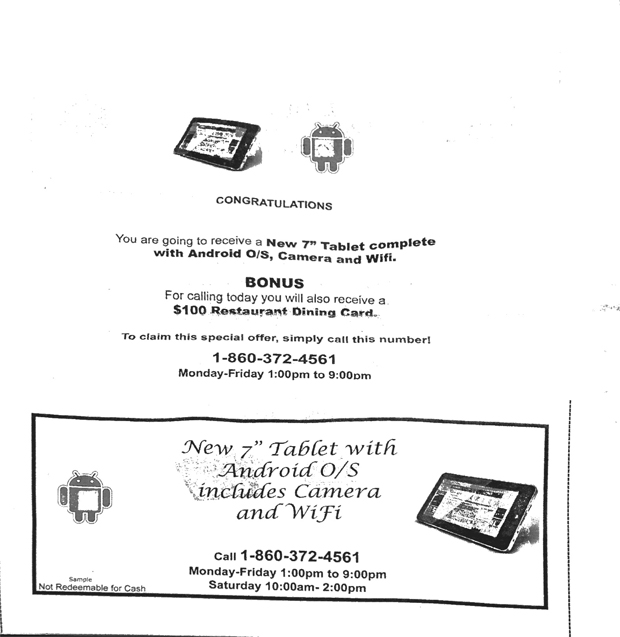 This notice sent by mail for a free Tablet may seem exciting at first, but there’s a catch. In order to receive your “New 7″ Tablet,” you must attend a 90-minute pitch for DirectBuy of Greater Hartford, a buying club that uses group buying power to get lower prices on various items. If you’re interested in sitting through the presentation, that’s fine — but this caveat is hidden in the Sometimes termed “mouse print” or, more benignly, “disclosure language”, and presented in miniscule font. It is there to take back every enticing offer made in the ad. behind a fold in the letter –along with other requirements– and you should know about it.