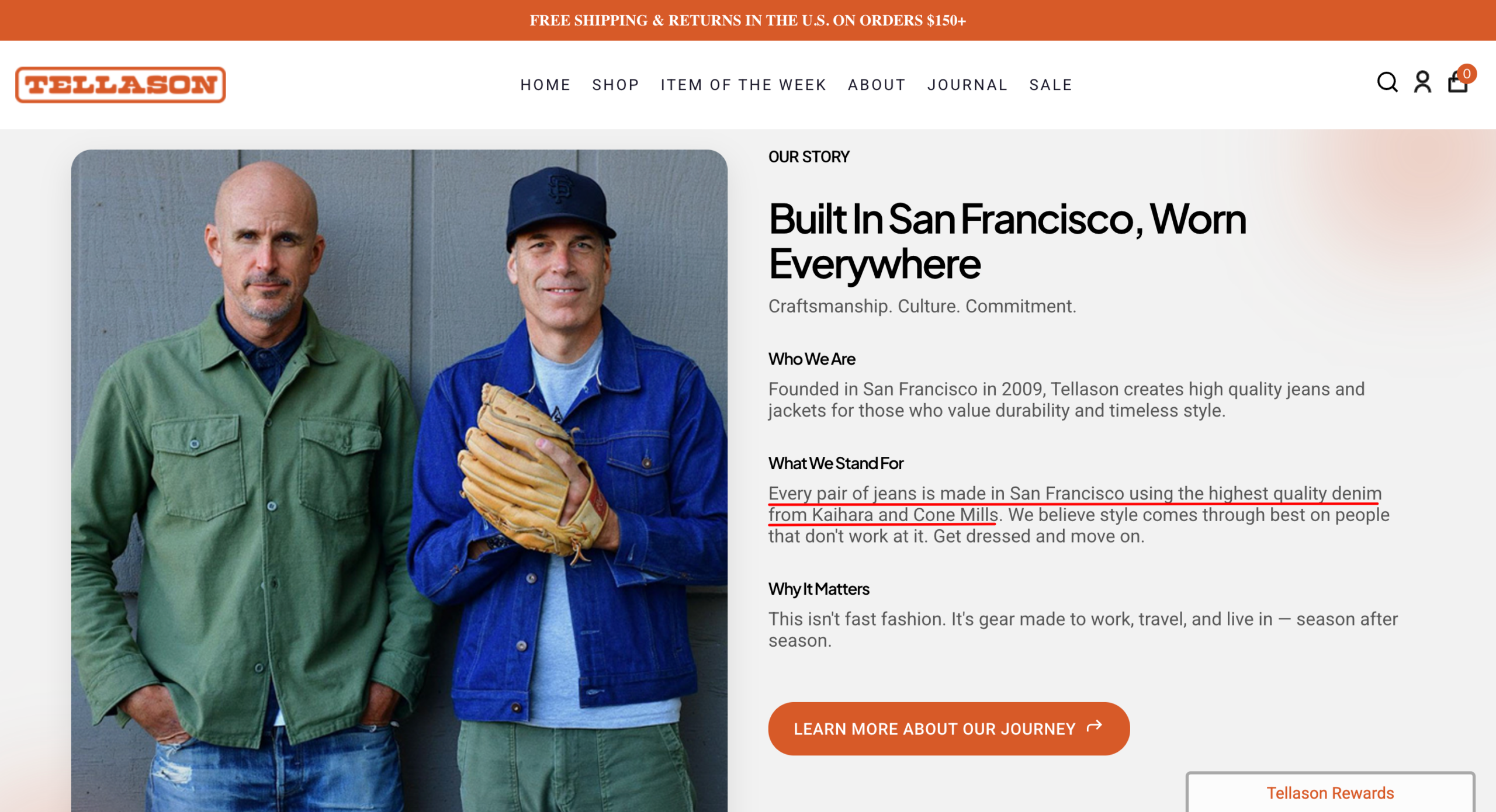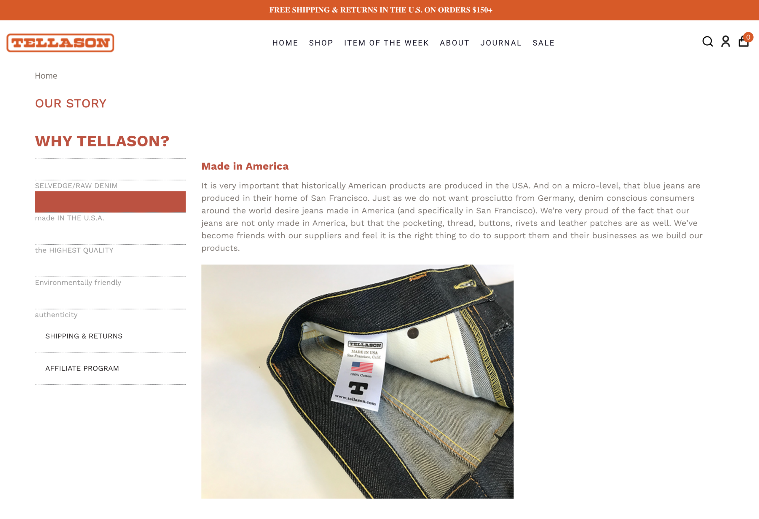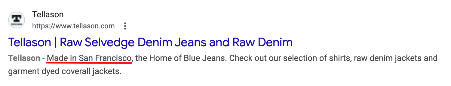 Since the days of the California gold rush, Americans have been wearing jeans. And according to Tellason, a denim clothing company based in San Francisco, it’s “very important that historically American products are produced in the USA.” That’s why, Tellason claims, its jeans are “Made in America” and “Built [i]n San Francisco.” The company reinforces this Made in USA messaging in a Google search result, where it claims that its jeans are “Made in San Francisco, the Home of Blue Jeans.”
