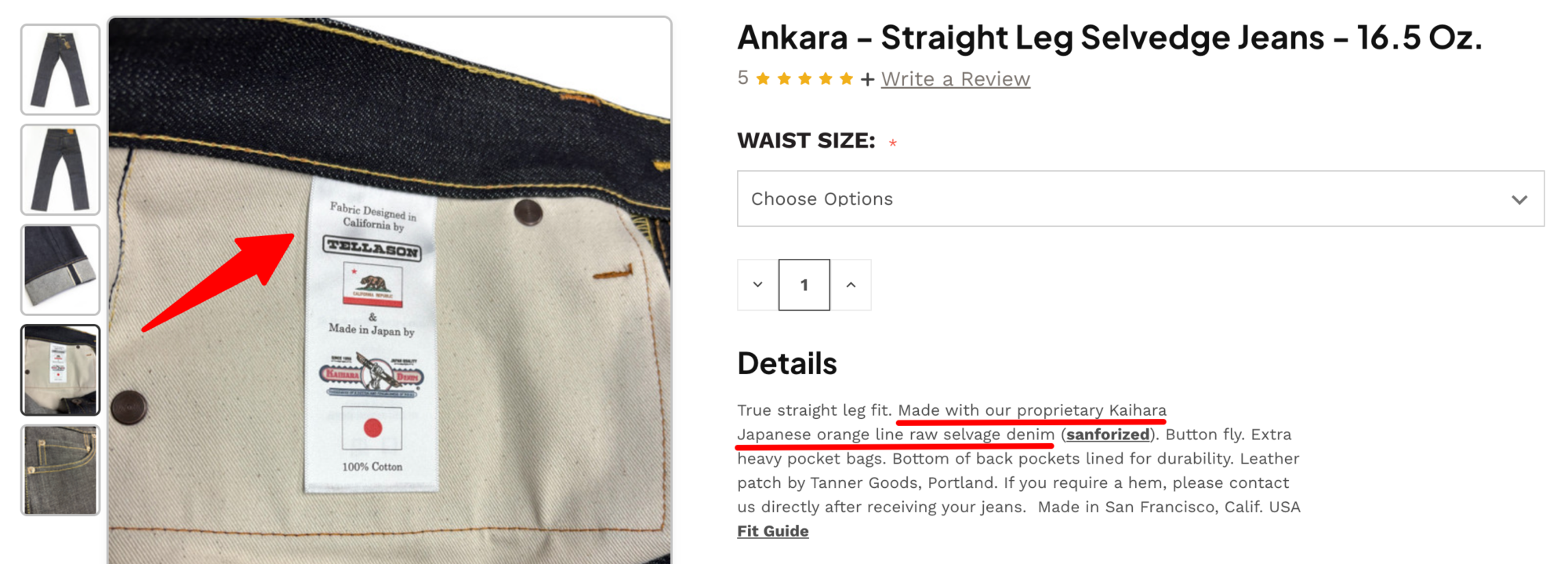 Today, only two of the jeans listed on the Tellason website are made from Cone Mills denim. (One pair doesn’t specify where the denim comes from.) The vast majority – 33 out of 36 styles – are made from Japanese-sourced denim, according to origin information on product pages, as well as product tags stating “Fabric Designed in California by Tellason & Made in Japan by Kaihara” (see second image in slider below).