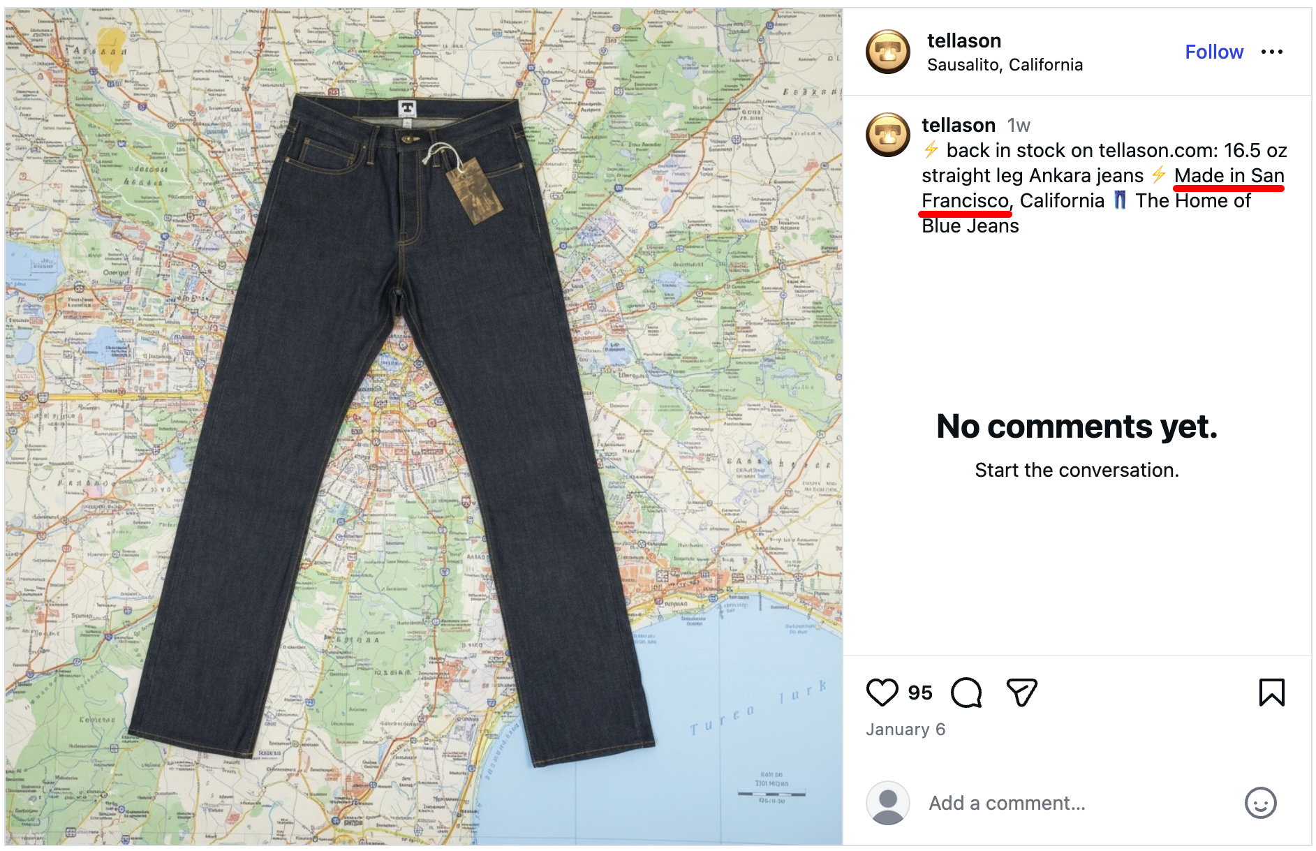 Yet this has not stopped Tellason from advertising its Japanese-sourced denim jeans as “Made in San Francisco.”