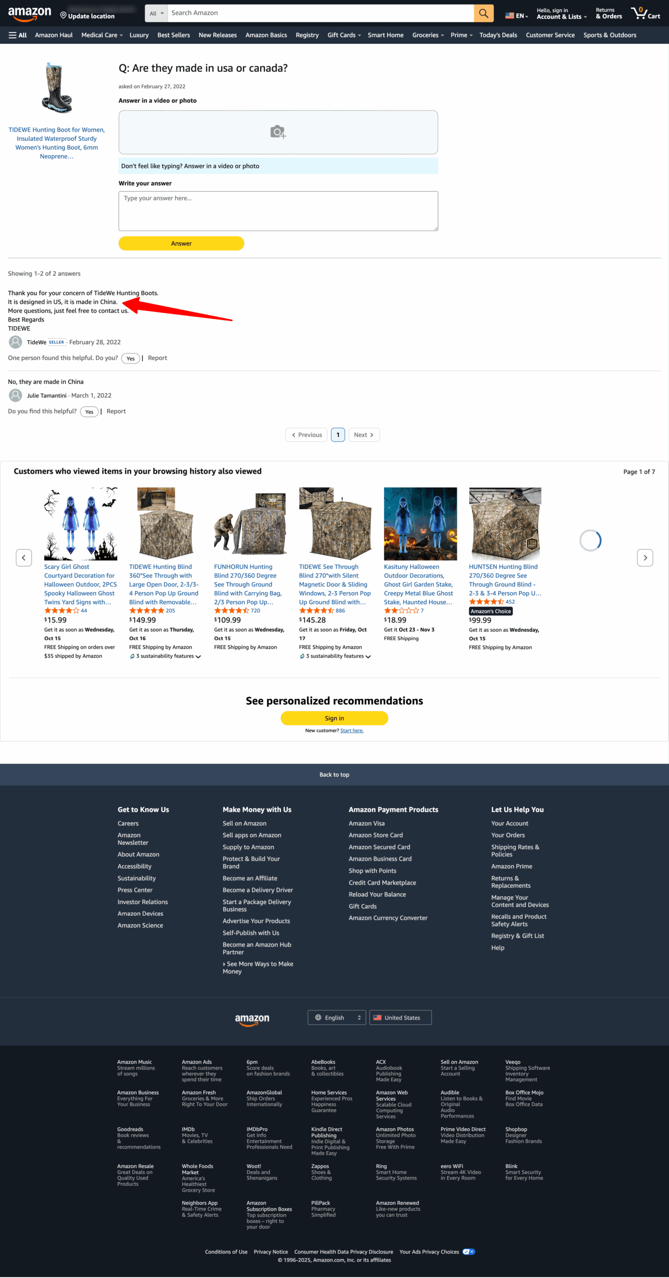 Also of note, in response to a question regarding its origin that a consumer left on Amazon in 2022, the company said that its hunting boots, while purportedly designed in the U.S., are “made in China.”