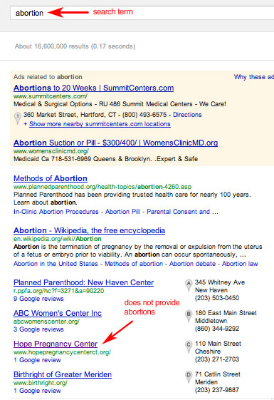 The law enacted in December 2009, was premised in part on reports that documented a pattern of deceptive advertising techniques used by some centers to attract women seeking abortions and comprehensive birth-control services. The deceptive advertising techniques included placing ads in the telephone book’s yellow pages under “abortion services” and on the Internet generated by keyword searches of “abortion” and “abortion clinics.”