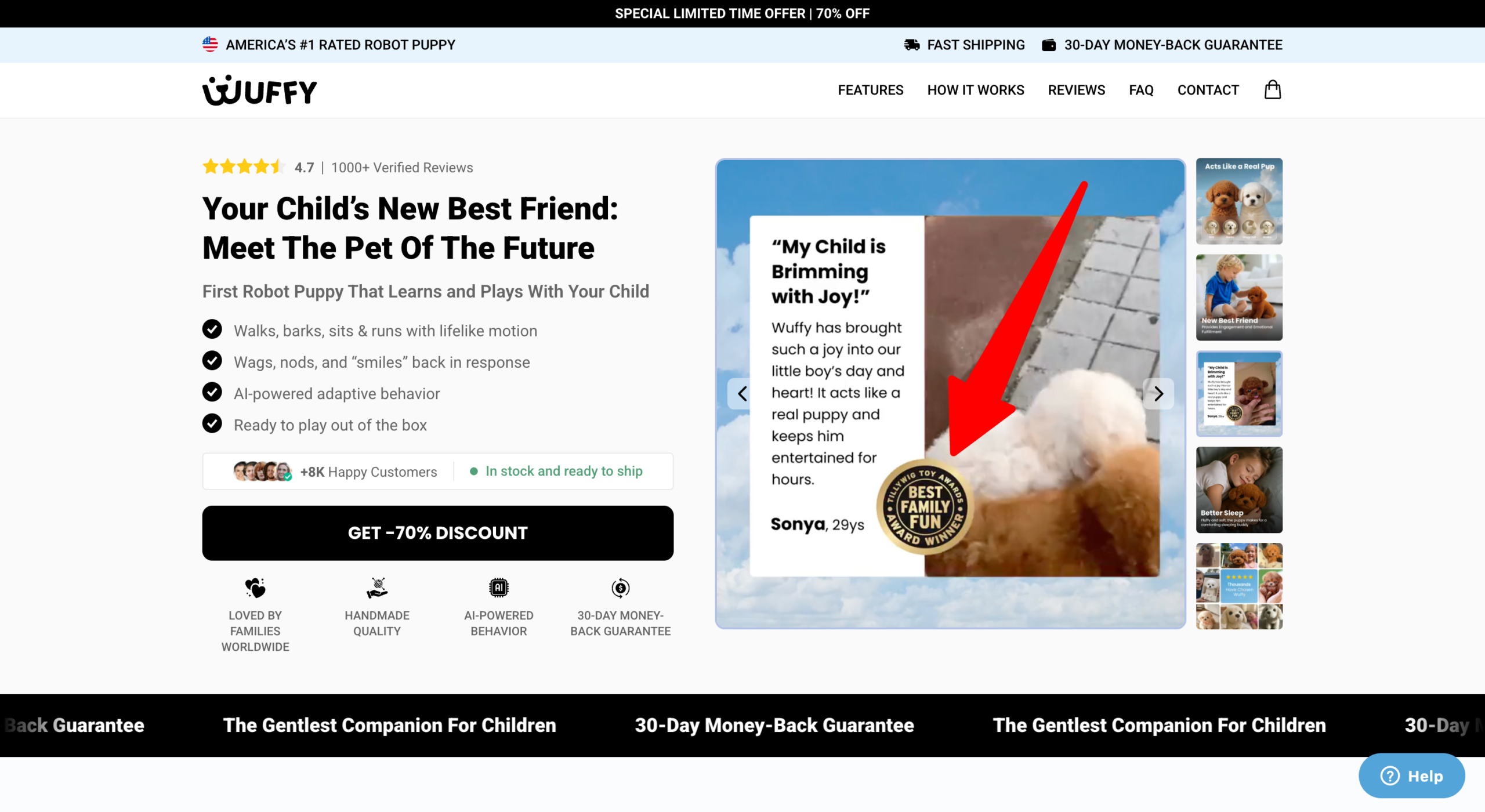 Take Wuffy’s size and how it changes dramatically throughout the video, from appearing as small as a coffee mug to half of Emma’s size. Meanwhile, the depictions of Wuffy in the video aren’t anything like what the product looks like – or seems capable of doing – on the website the ad links to – getwuffy.com: