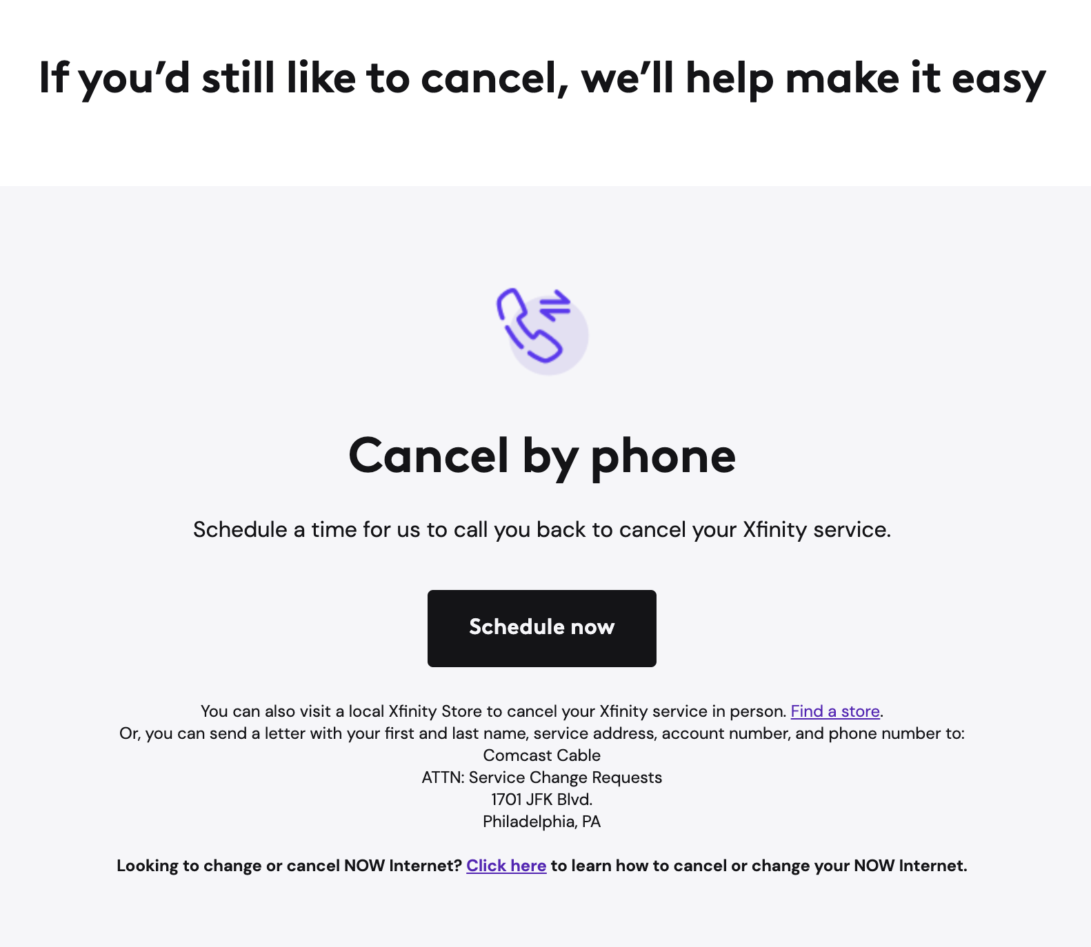 While you can sign up with Xfinity online, the company does not allow you to cancel online. On its “Cancel” page, beneath several other options that do not include cancellation, Xfinity informs consumers that they either have to call to “schedule a time” for the company to then call them back to cancel over the phone or visit an Xfinity store to cancel service in person.